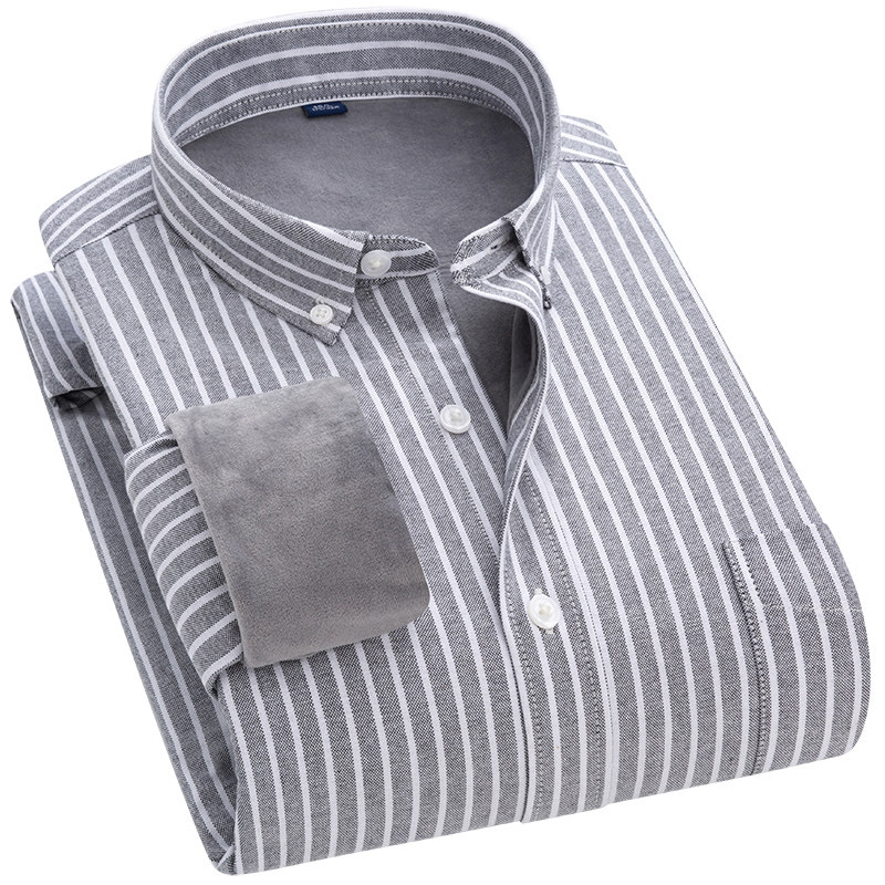 纯棉保暖衬衫男士帅气灰色直条纹加厚加绒衬衣冬韩版休闲潮流棉衣