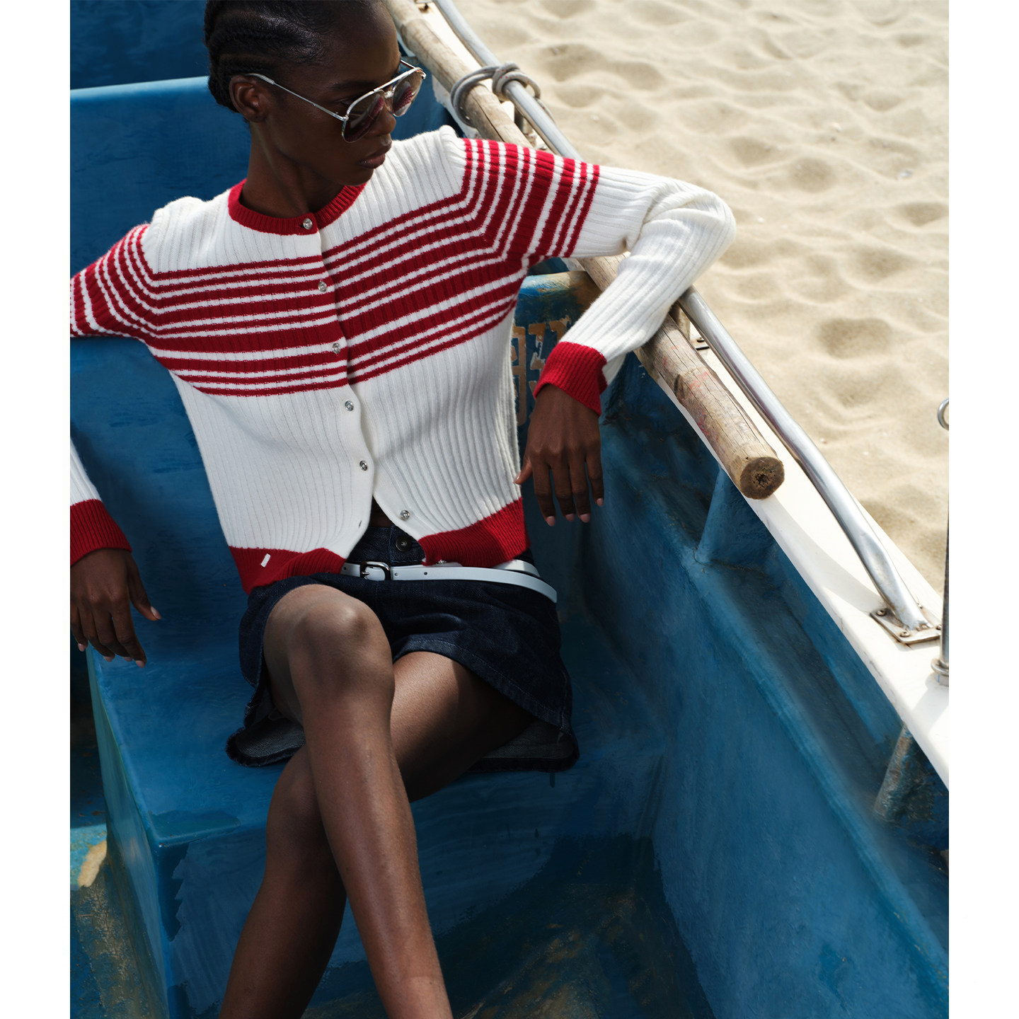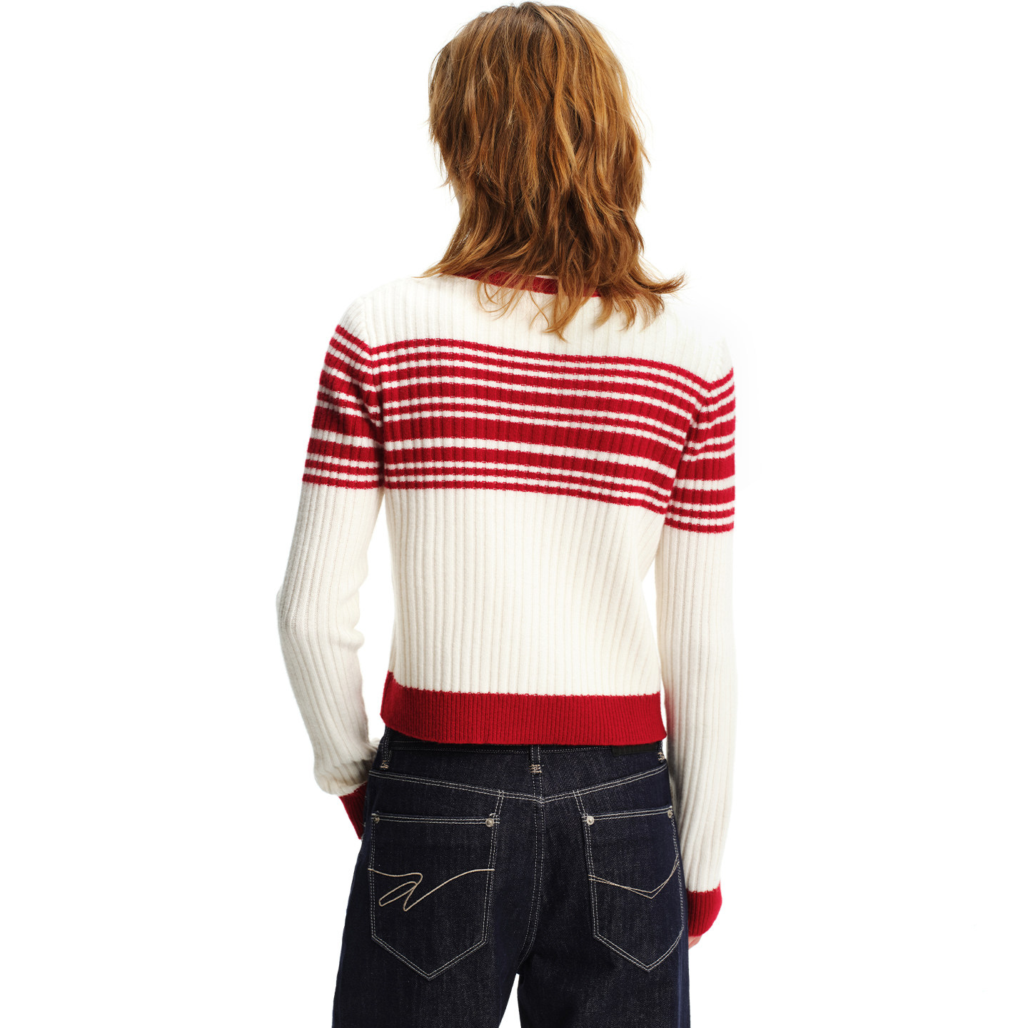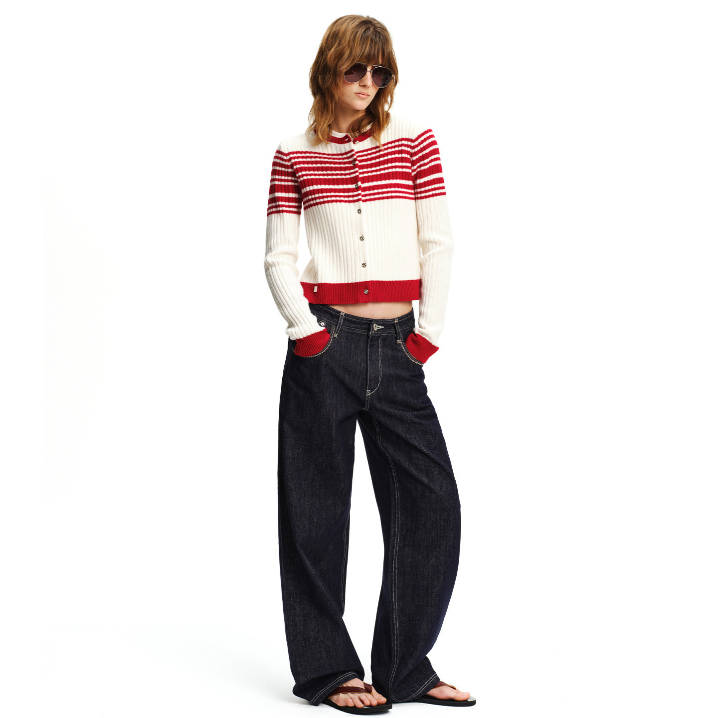 SMIIILE红色条纹纯羊毛针织开衫女春季圆领毛衣外套短款上衣修身
