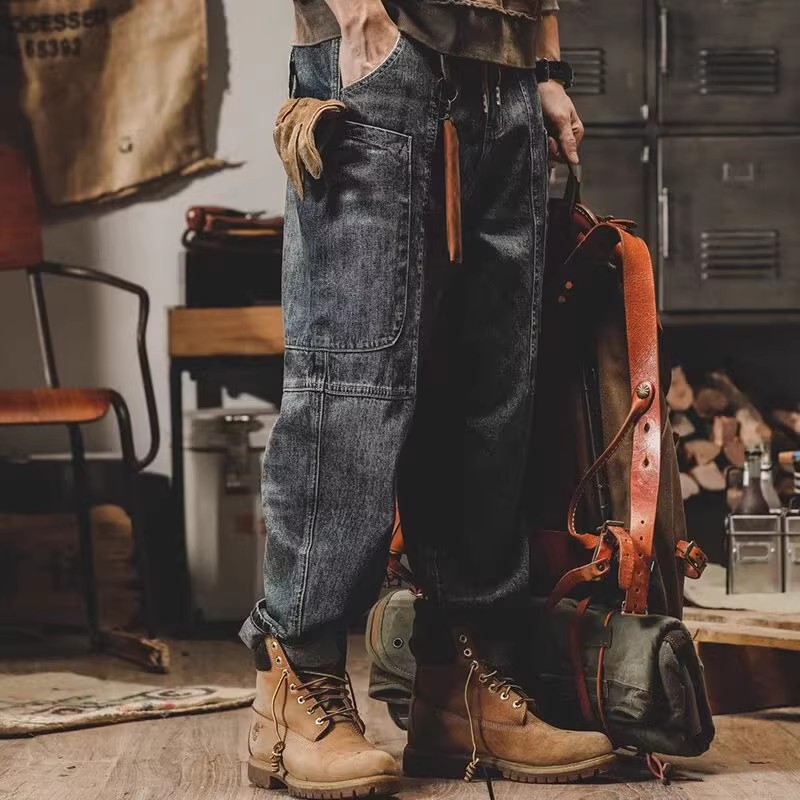 日系复古工装牛仔裤新款美式春秋潮牌宽松直筒口袋大码哈伦裤子男