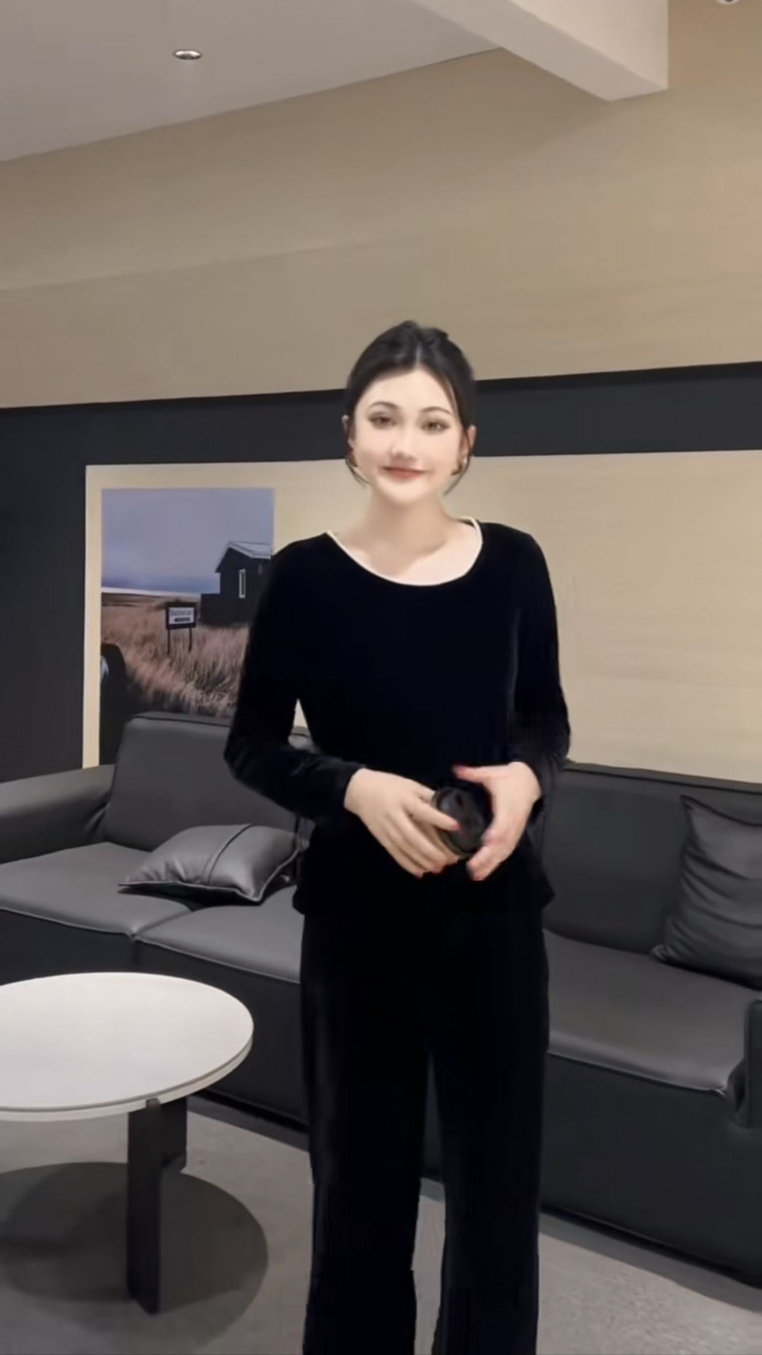 圆领长袖金丝绒T恤衫女设计感蕾丝美背打底衫钉珠法式黑色上衣