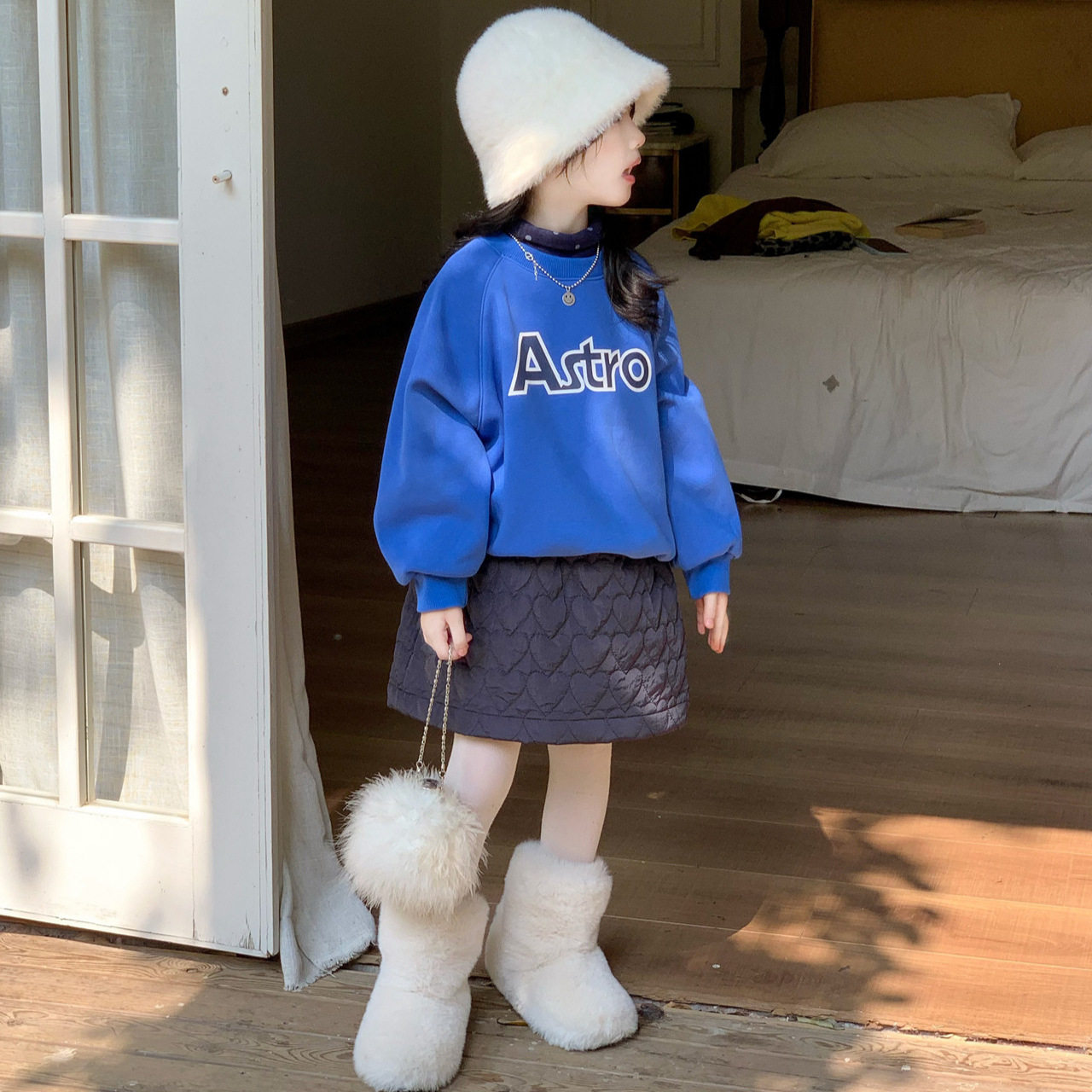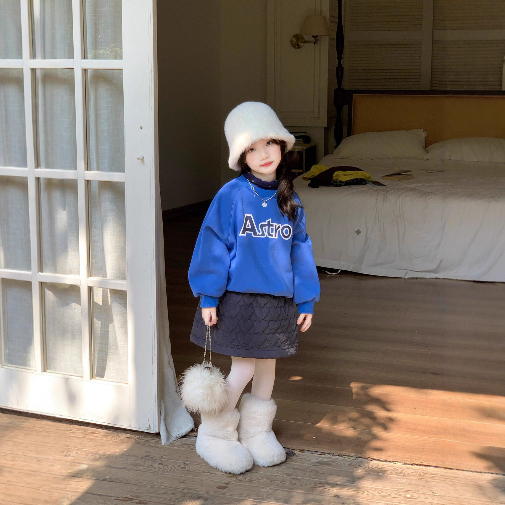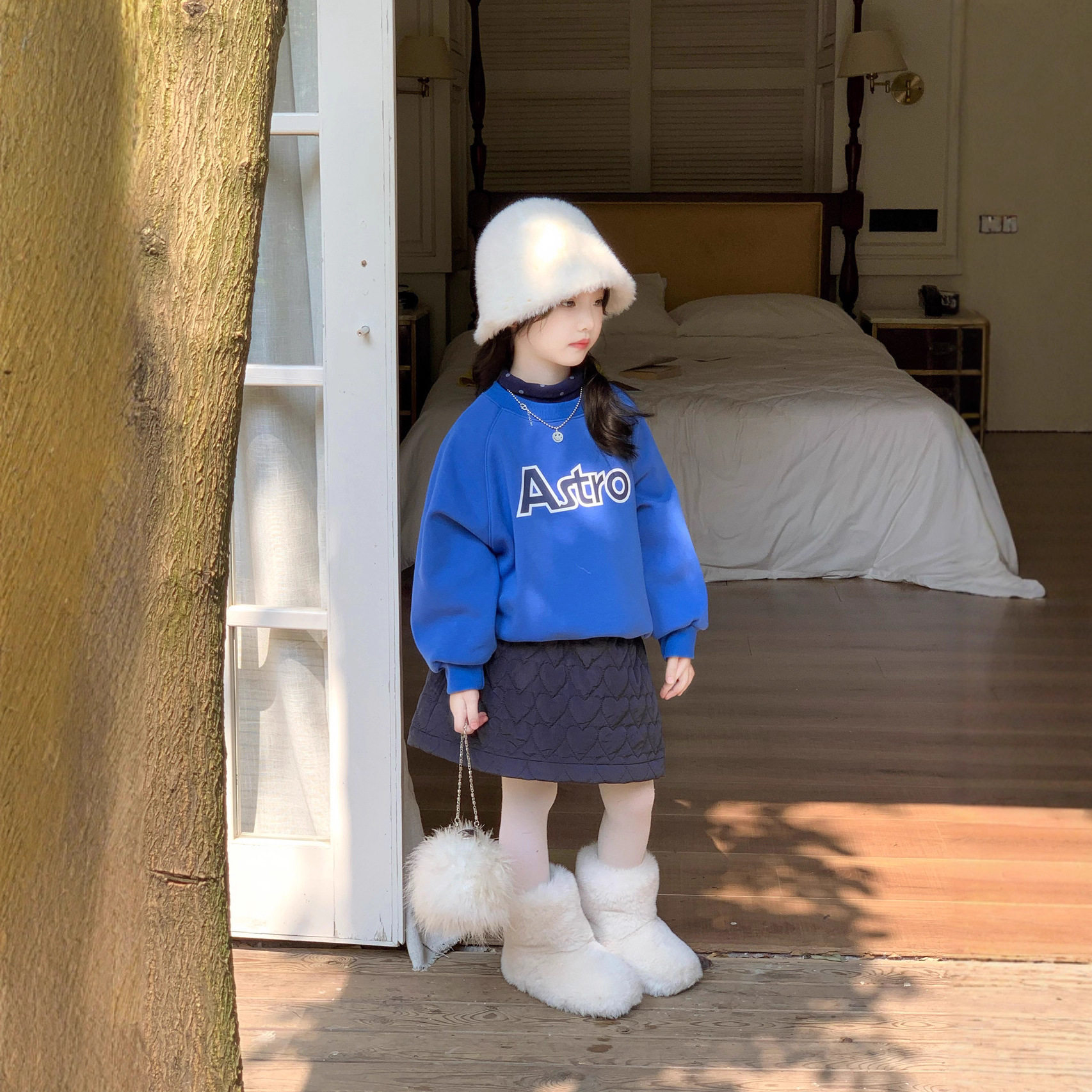 女童加绒卫衣冬装韩版儿童蓝色加厚套头衫女宝宝宽松休闲上衣套装
