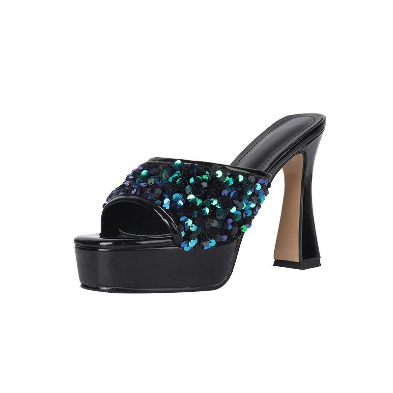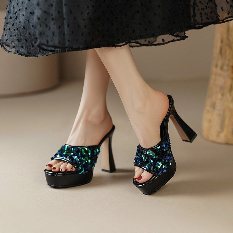 拖鞋女夏鱼嘴外穿黑色2025新款亮片防水台女士一字拖真皮高跟凉鞋