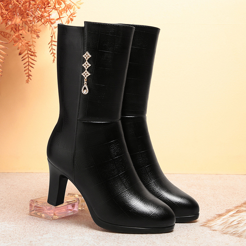 中筒靴女粗跟秋冬新款软皮尖头防水台软皮高跟短靴女加绒一件代发