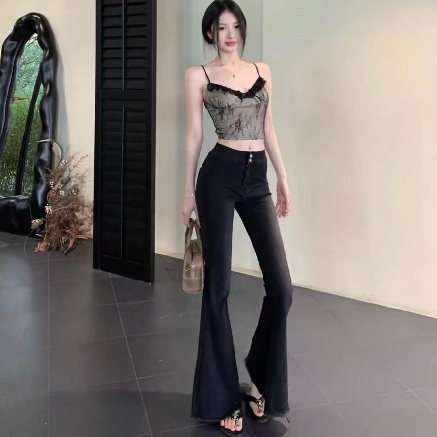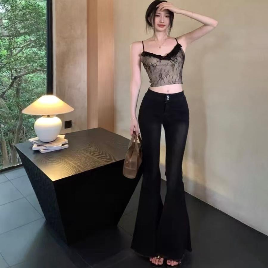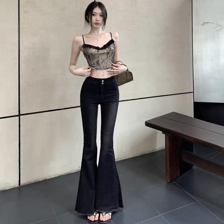 辣妹时髦气质黑色毛边微喇叭牛仔裤女小个子修身弹力鱼尾拖地裤潮