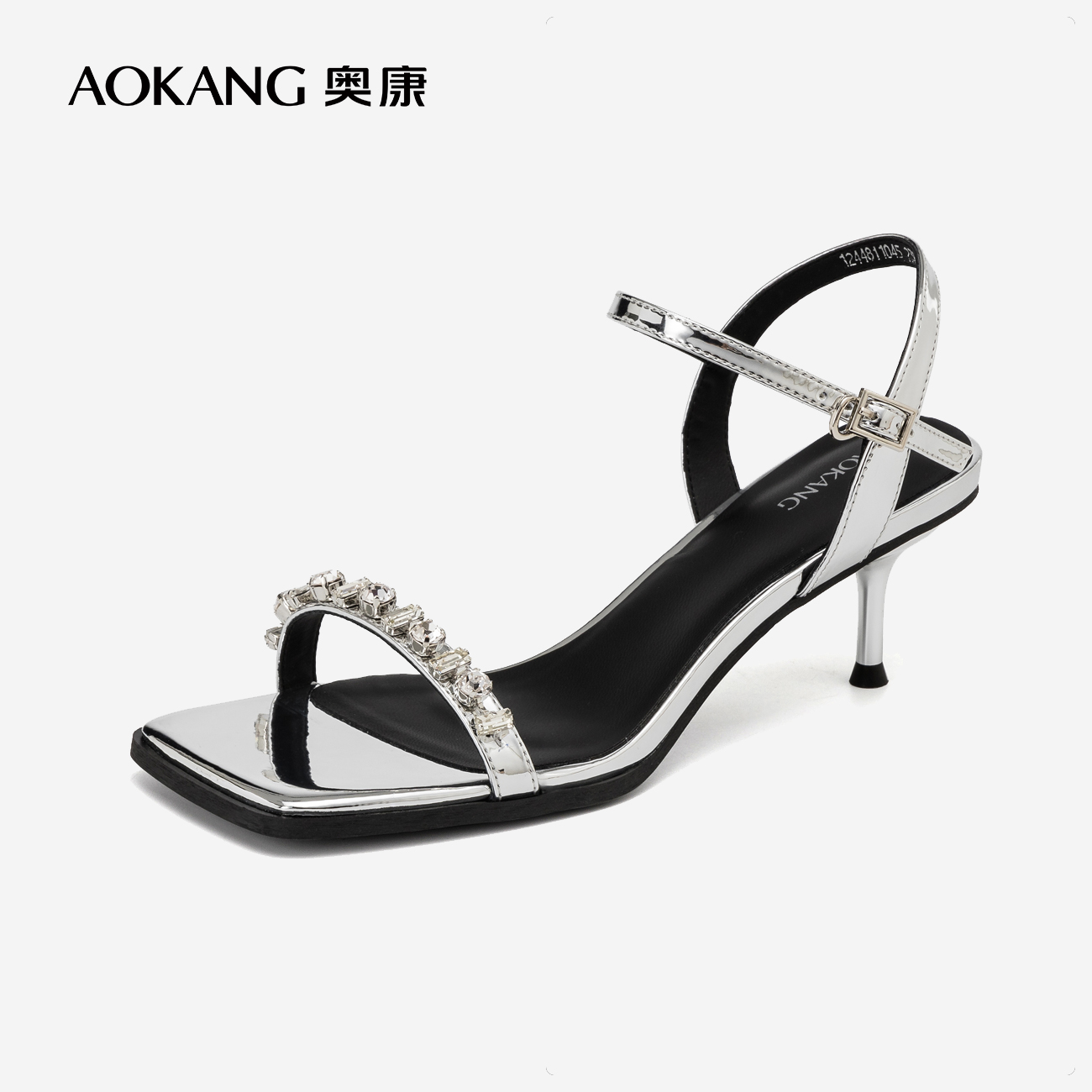 奥康女鞋 新款银色气质水钻一字搭扣时装凉鞋细高跟鞋