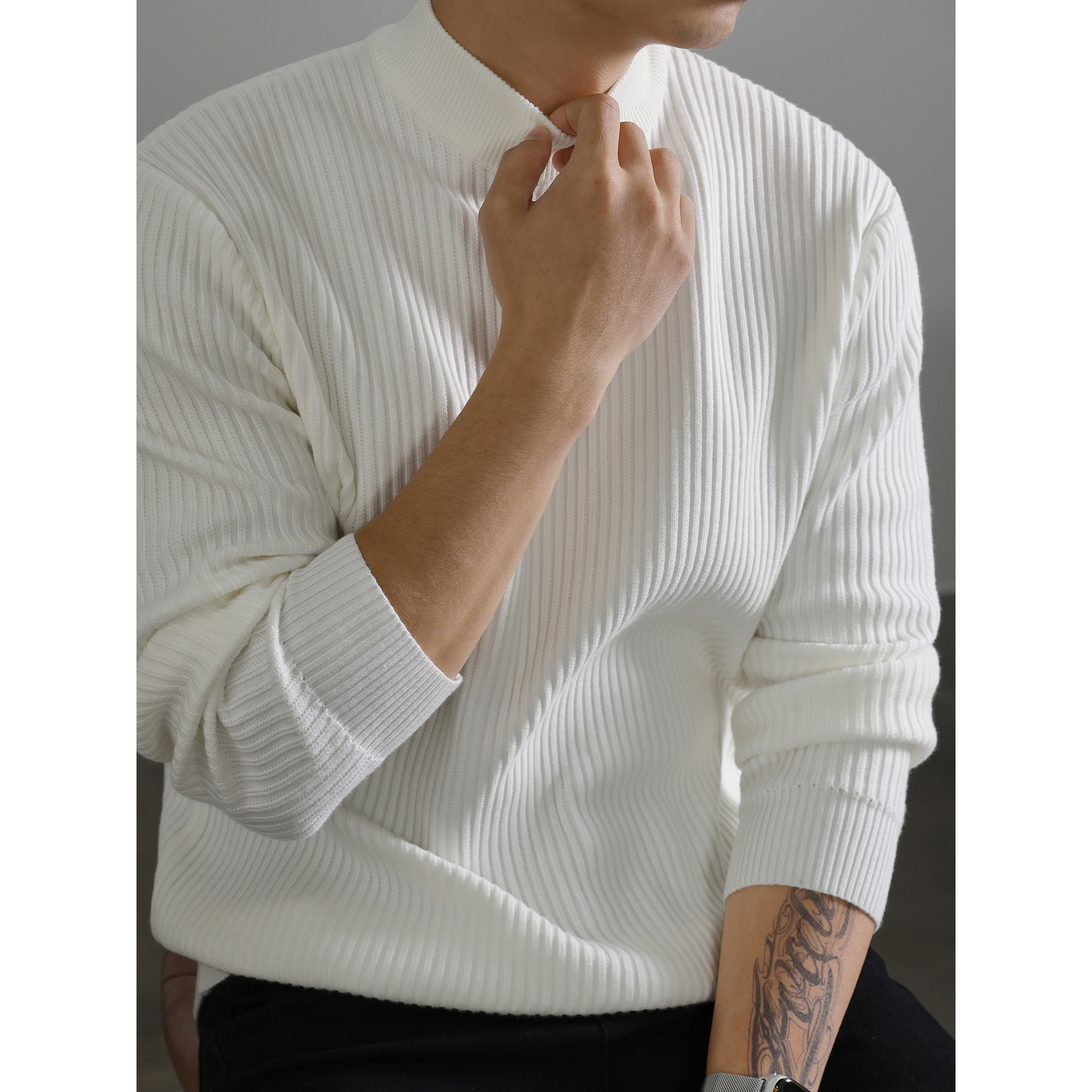 LUUD 白色简奢坑条纹理感半高领毛衣男士冬季保暖打底针织衫上衣