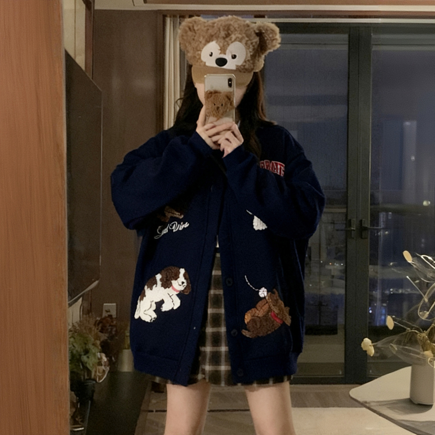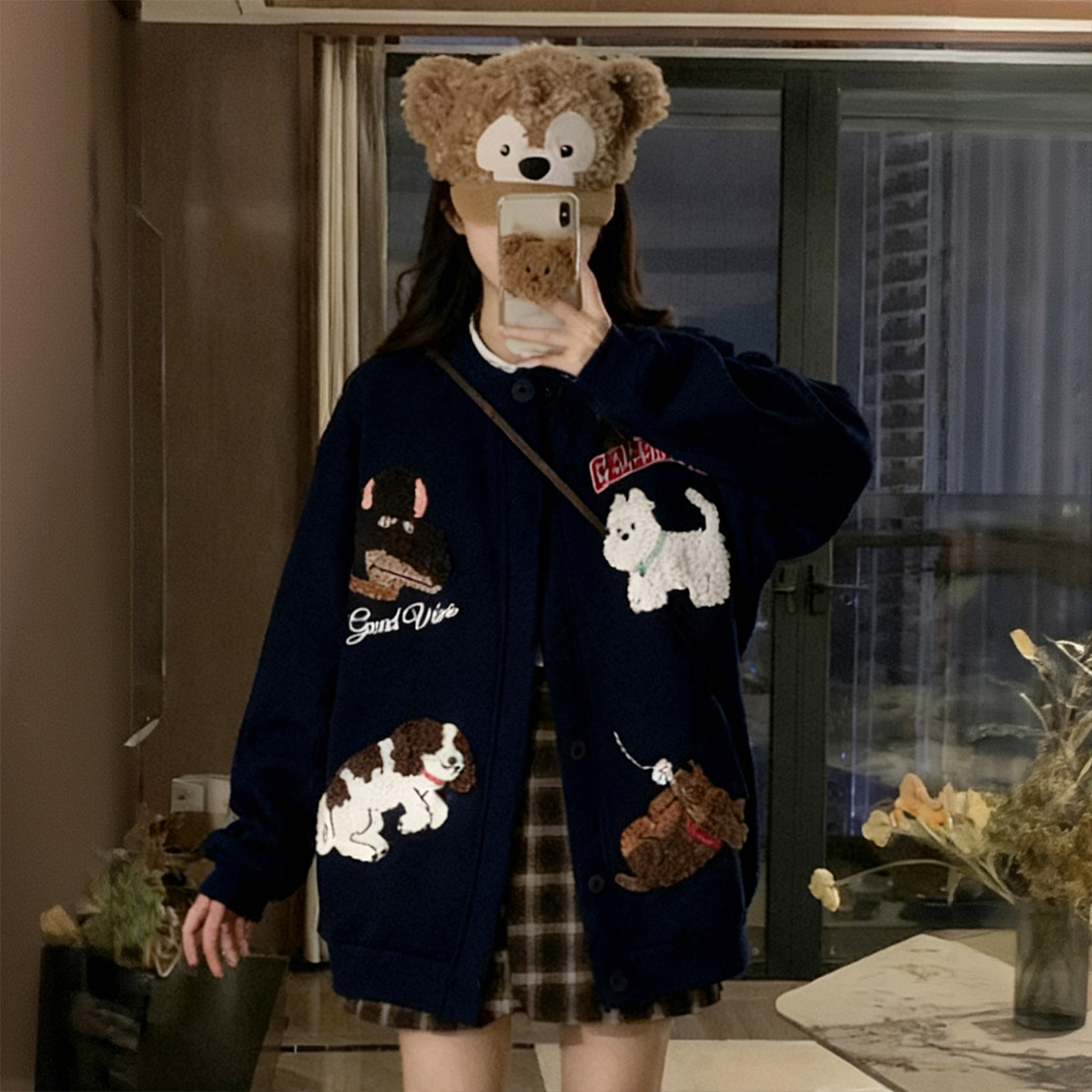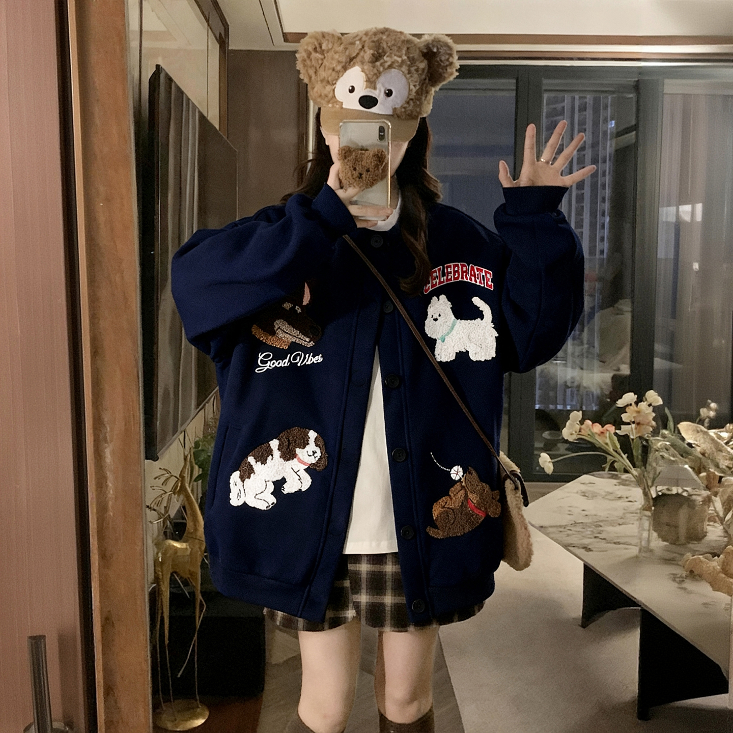 特大码美式学院风卡通小狗刺绣开衫卫衣女胖mm减龄气质棒球服外套