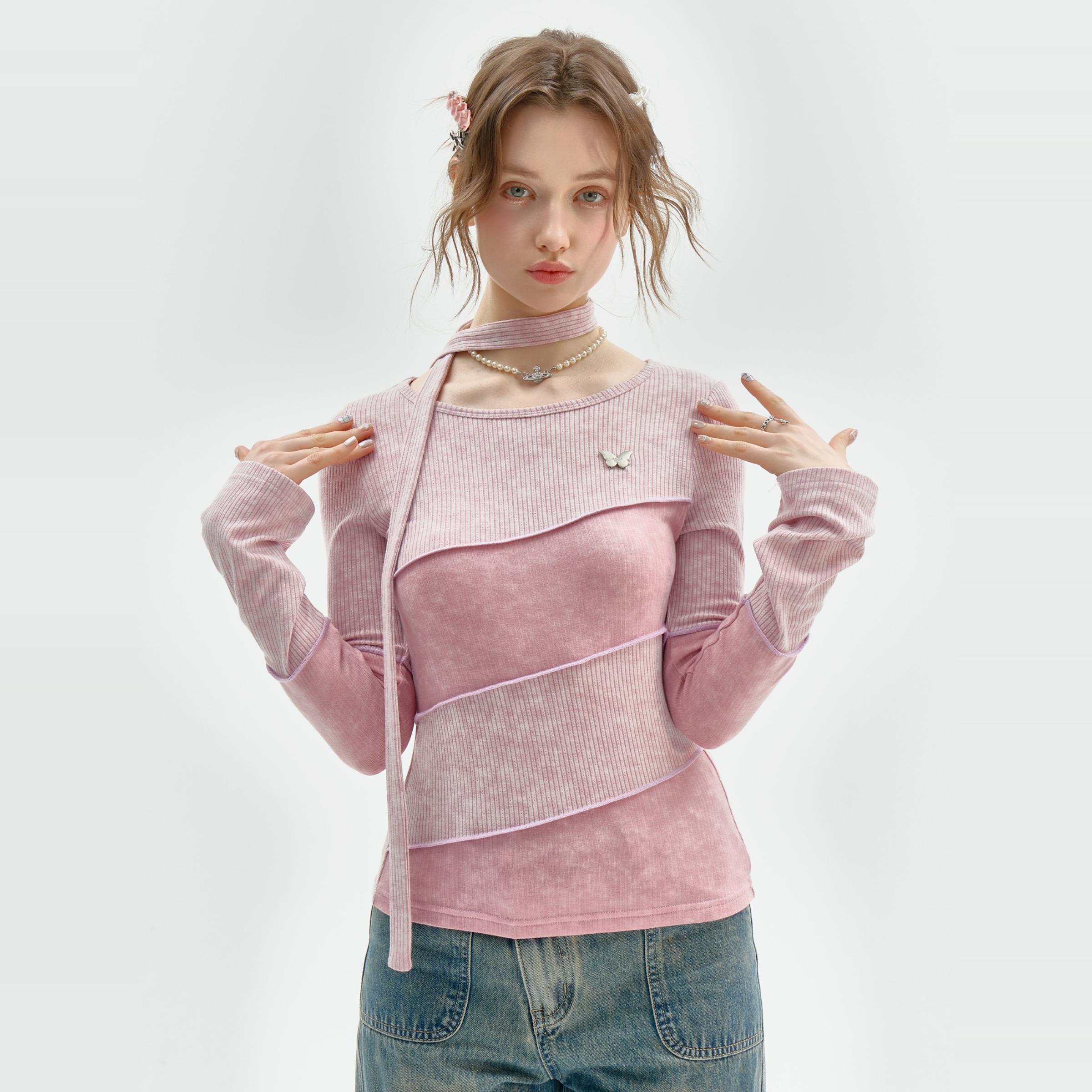 ziziFei设计感美式复古斜纹拼接围脖长袖T恤修身显瘦针织打底衫女