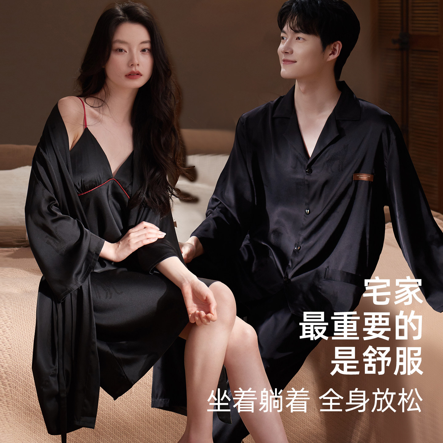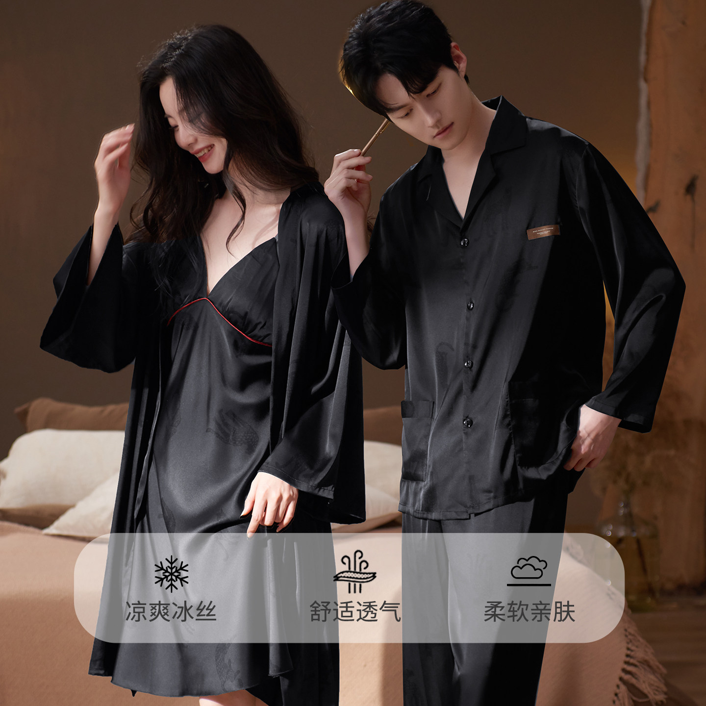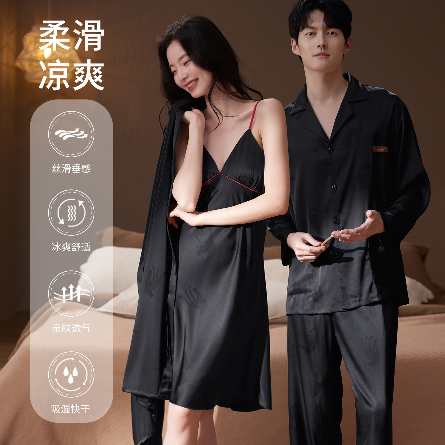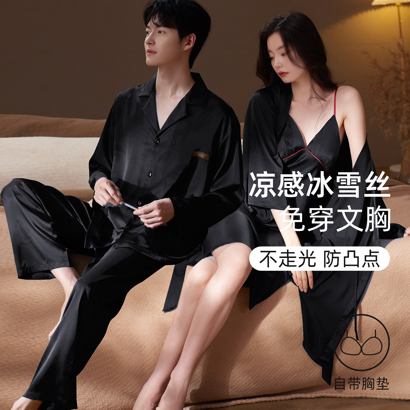 乐姿梦冰丝情侣睡衣春秋季女性感带胸垫吊带睡裙丝绸男套装家居服