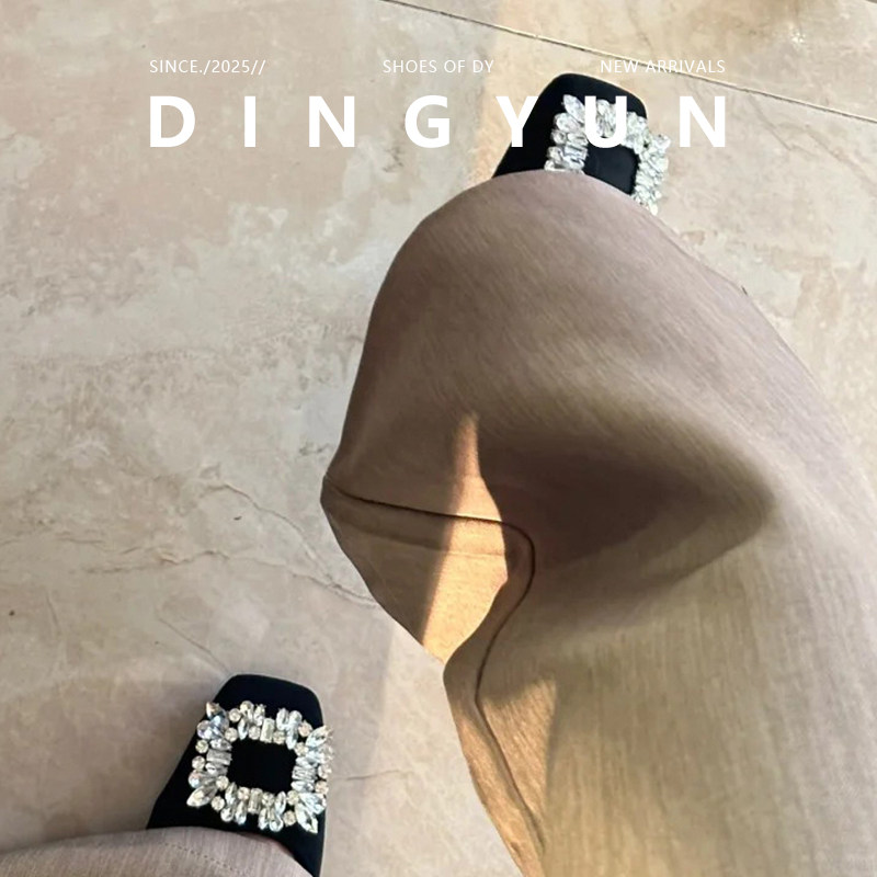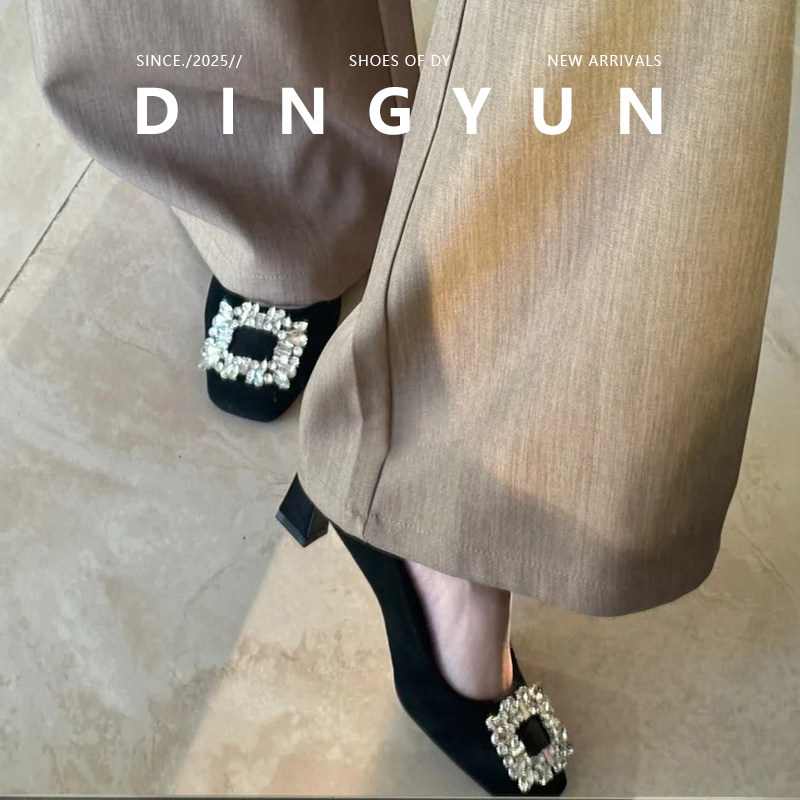 【丁允】方头水钻绒面中跟浅口单鞋女气质法式通勤百搭高跟鞋2026
