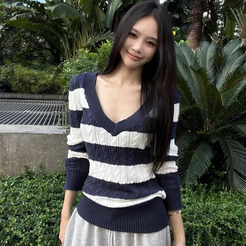 撞色条纹v领长袖打底针织衫女秋冬季修身麻花毛衣内搭高级感上衣