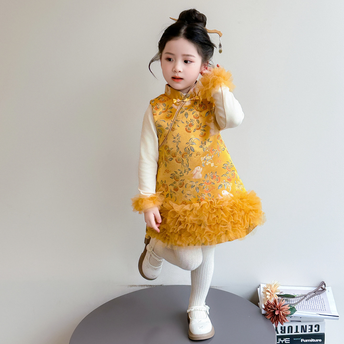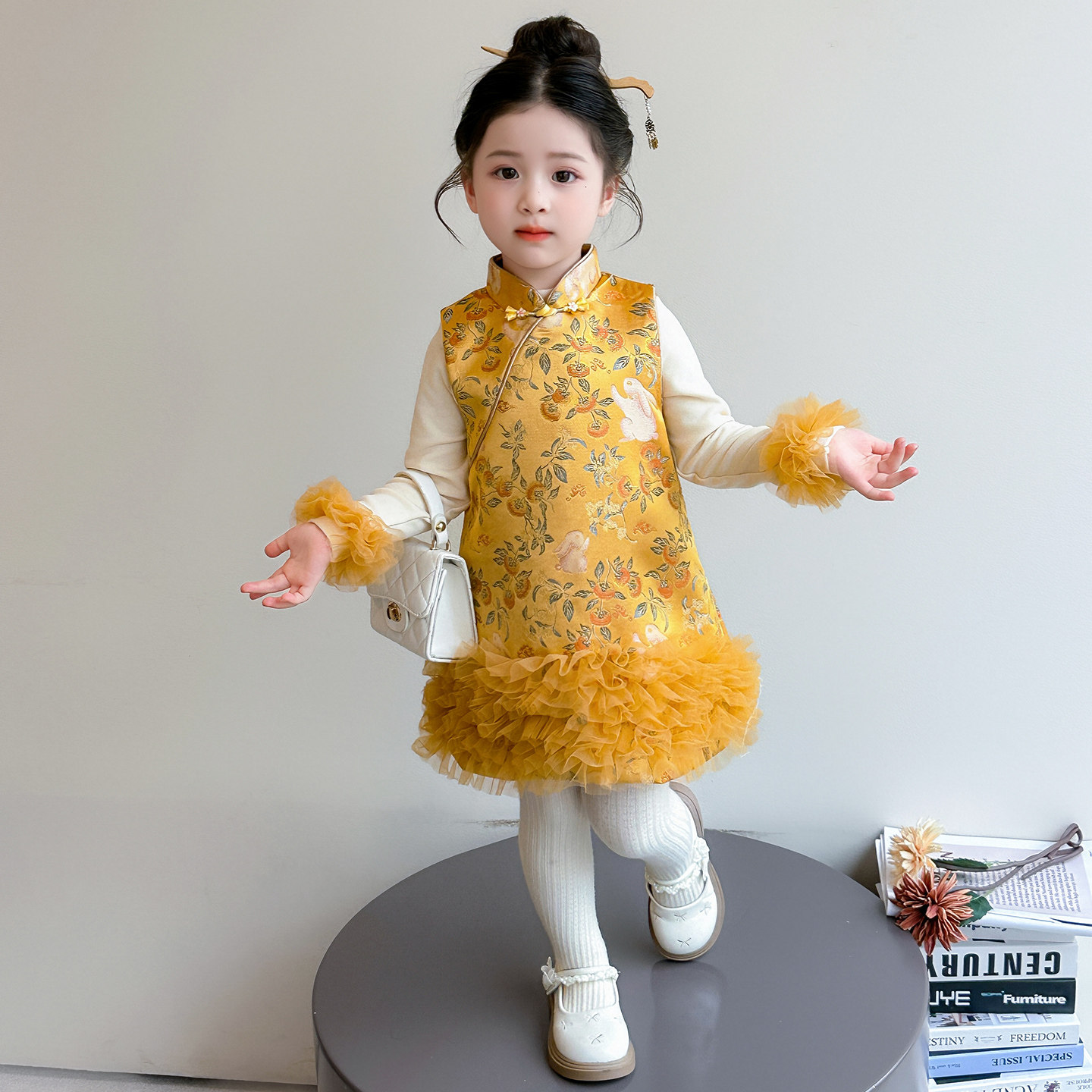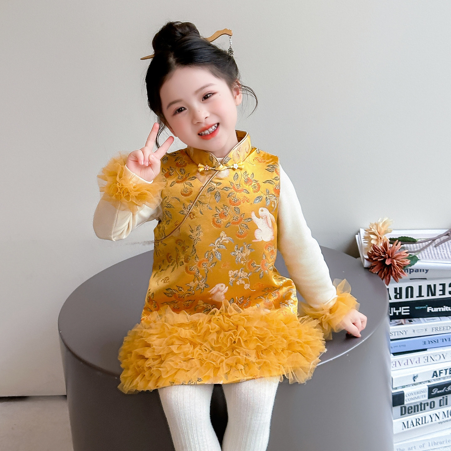 女童旗袍背心裙加厚套装2025年女宝拜年服儿童新年两件套裙子冬装