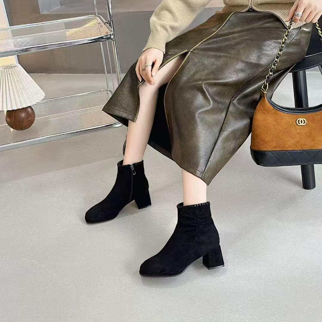 宣典2025法式美拉德粗跟短靴女瘦瘦靴方头高跟女靴子绒面靴马丁靴