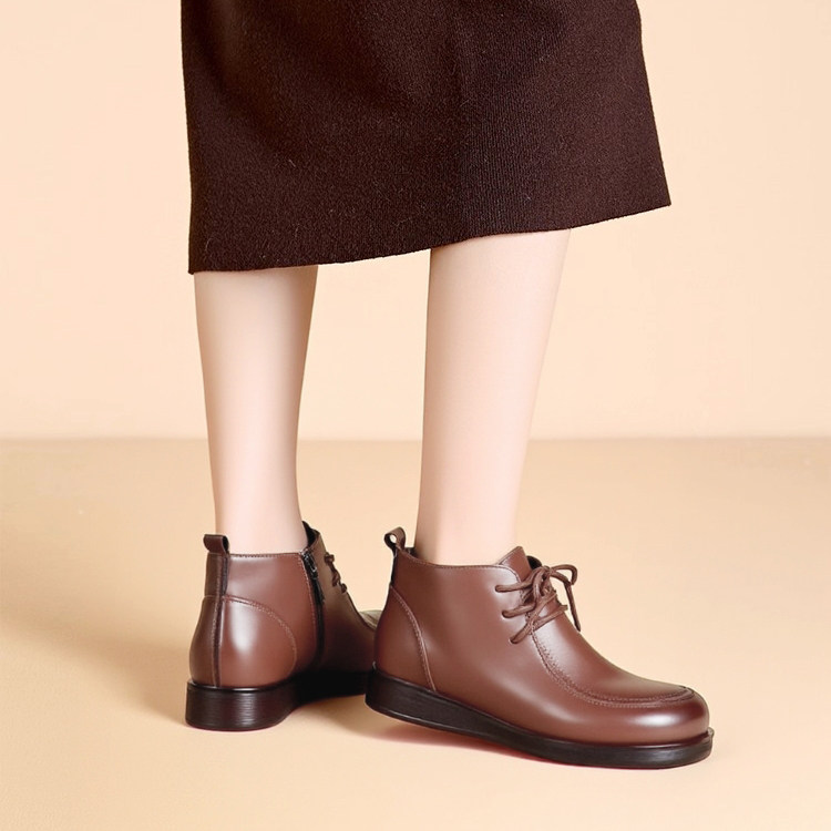 蓝棠牛皮鞋b1515/1516圆头坡跟短筒绒里冬季侧拉链女靴妈妈高帮鞋