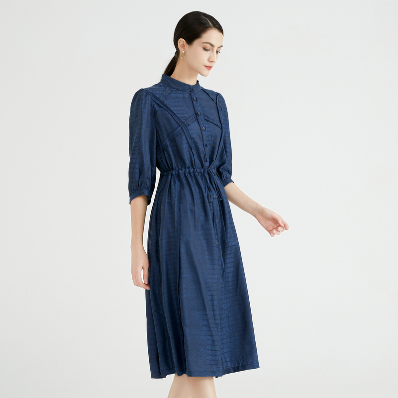 马天奴夏季新款女蓝色印花连衣裙子衬衫裙七分袖长裙收腰排扣时尚