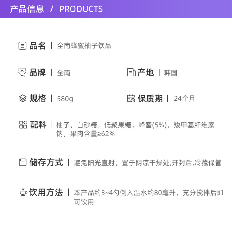 【自营】韩国进口全南蜂蜜柚子茶580g果酱饮料冷热冲饮清爽富含VC