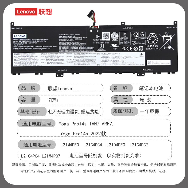 联想原装 Yoga Pro 14s 2022 14s ARH7/IAH7 L21M4PE0 L21C4PC4 L21D4PE0 L21C4PC7 L21M4PC7 笔记本电池
