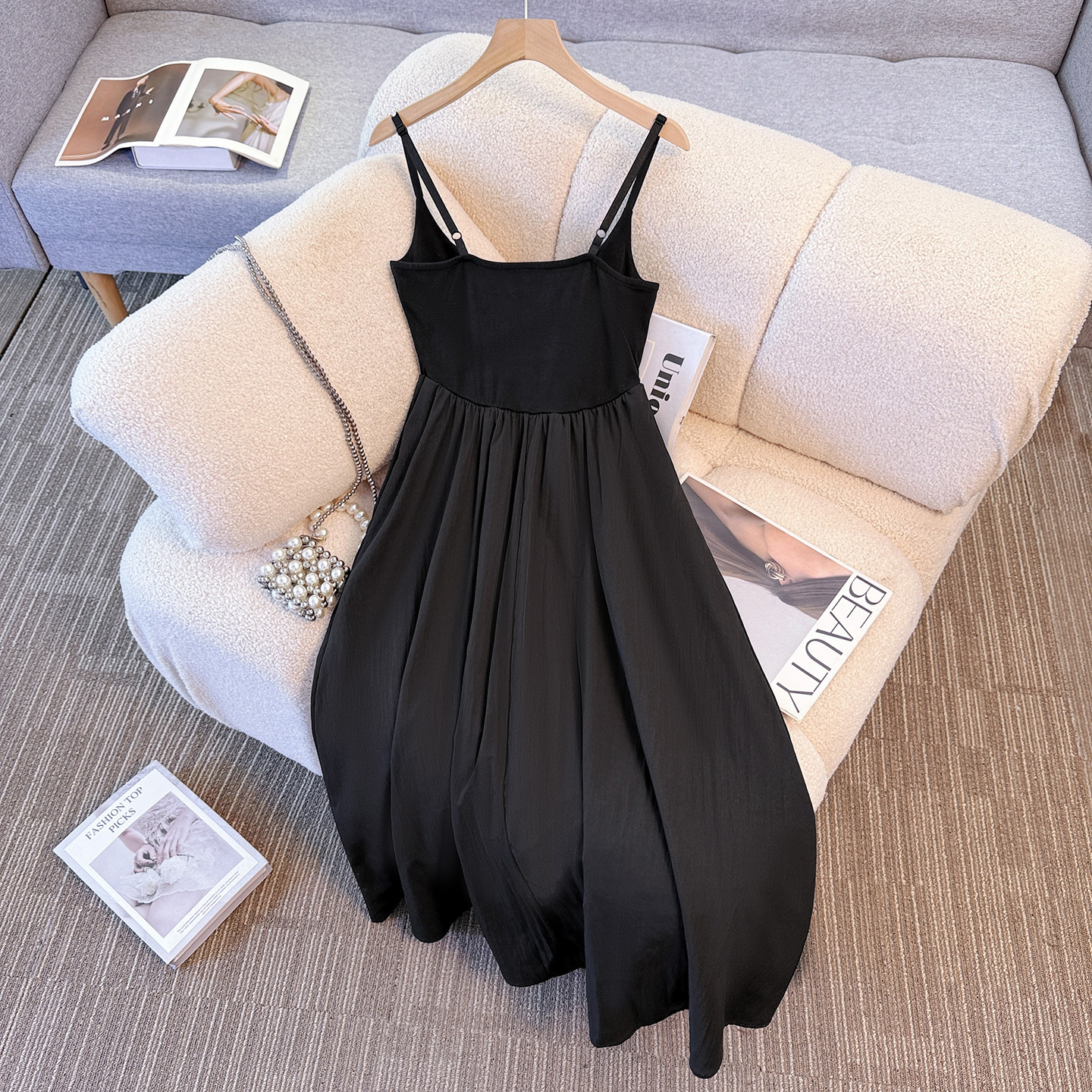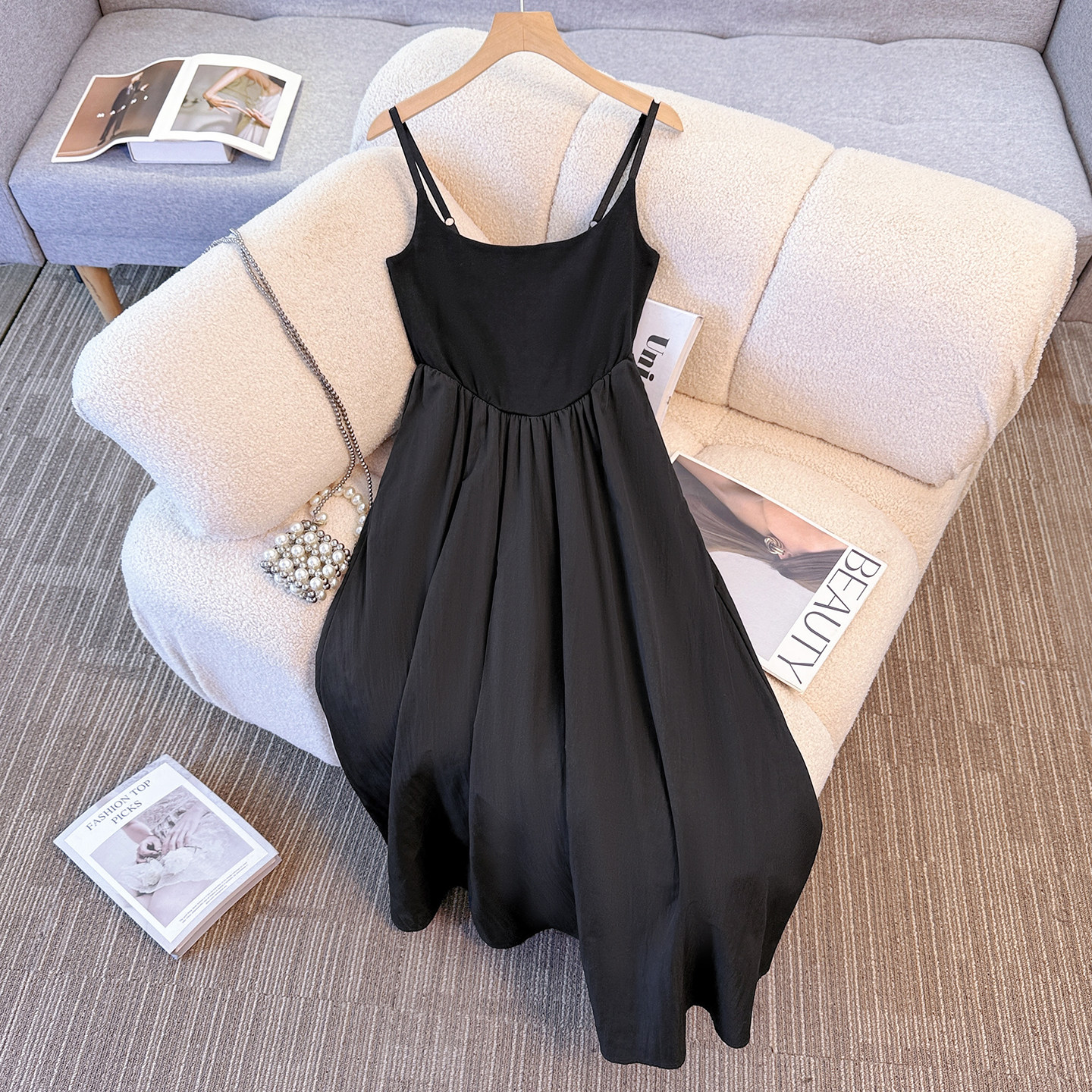拉夏贝尔黑色吊带连衣裙女2026春季新款弹力收腰显瘦百搭背心长裙