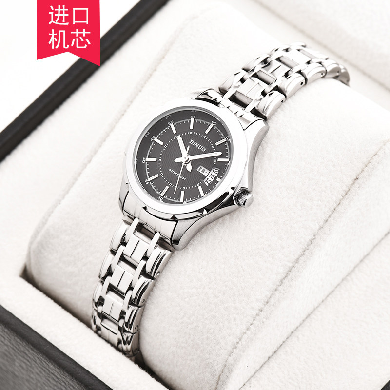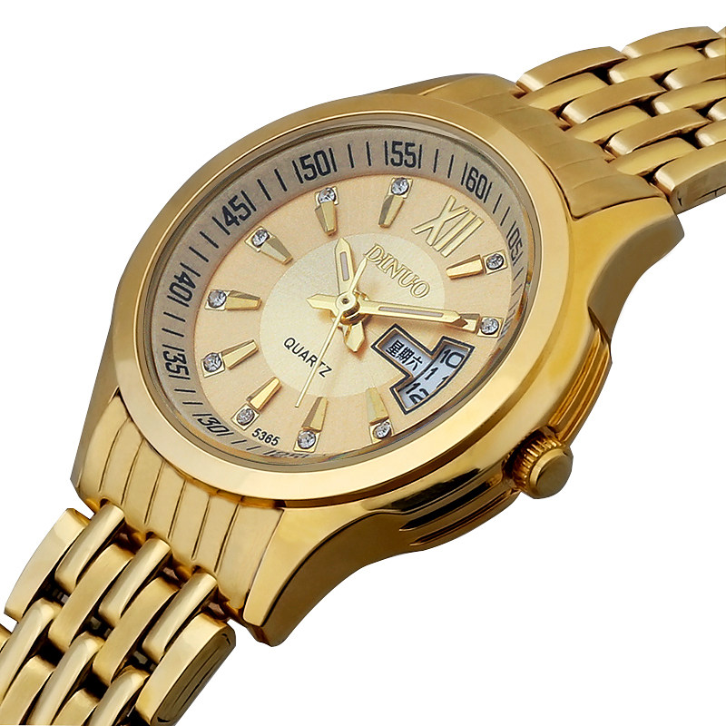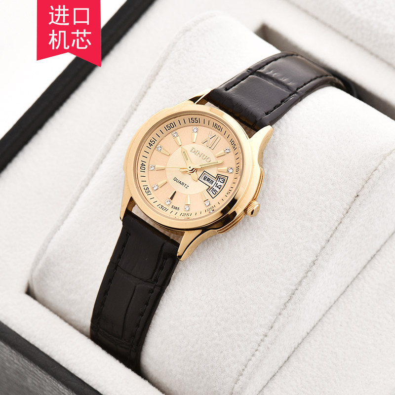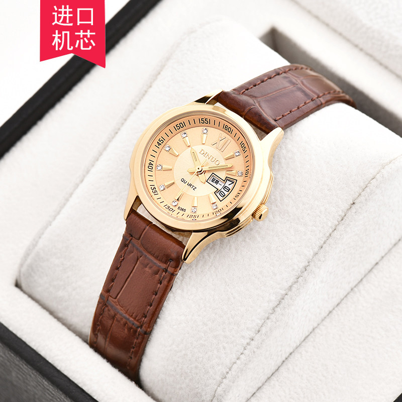 正品谛诺手表 女士双历夜光石英表 防水复古超薄时尚休闲金色女表