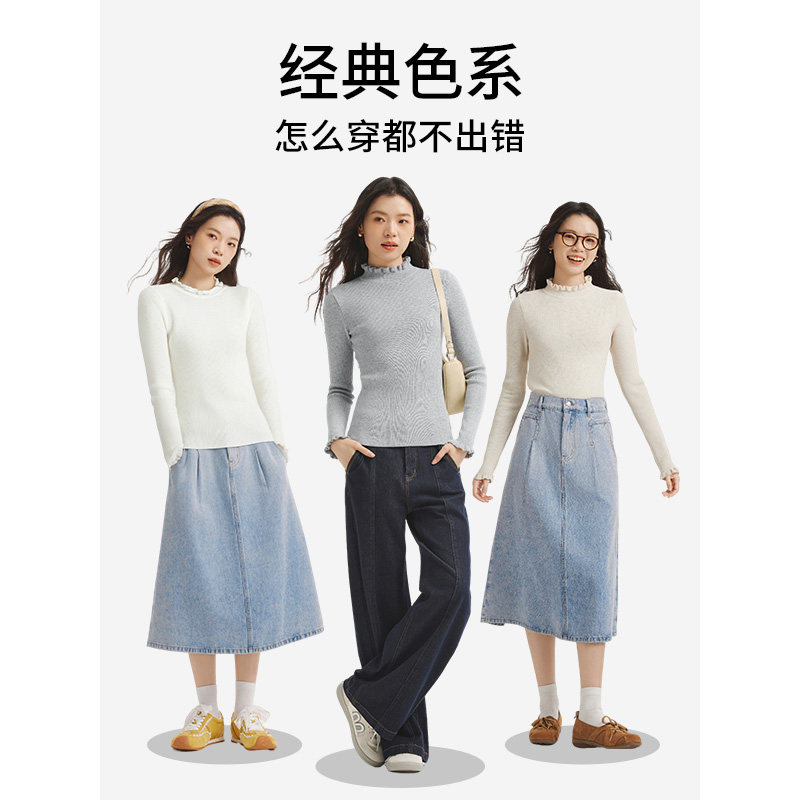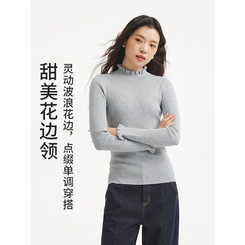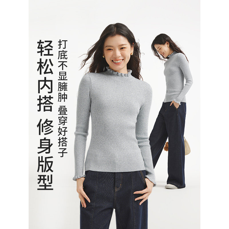 热风女士花边半高领打底衫2025年冬季新款修身显瘦内搭打底衫毛衣