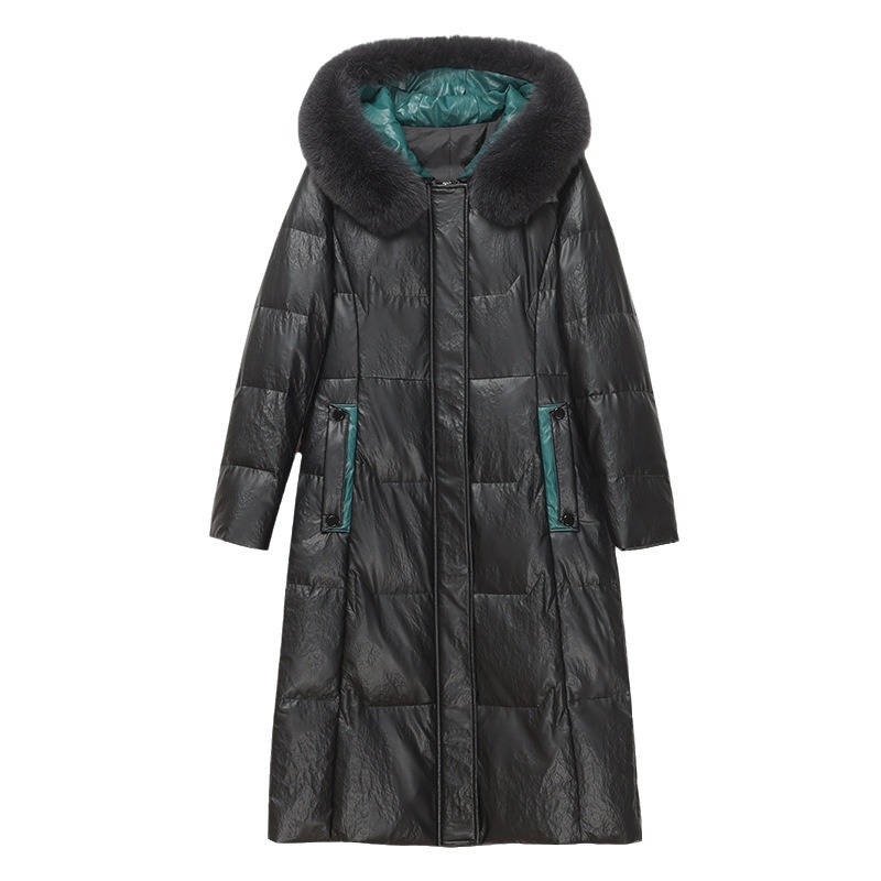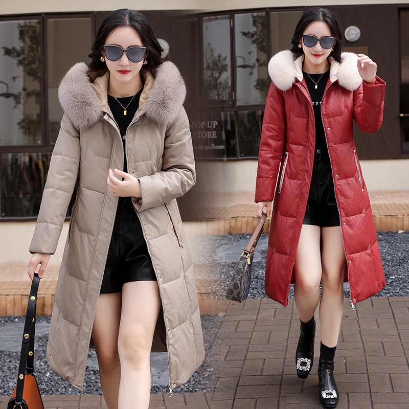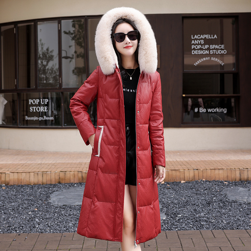2023冬海宁真皮羽绒服女士中长款皮衣修身过膝大码外套连帽妈妈装