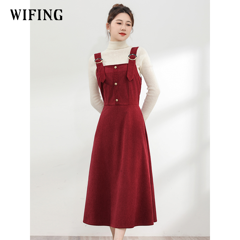 未风红色复古灯芯绒背心裙女2025秋季新款女装吊带裙子打底连衣裙