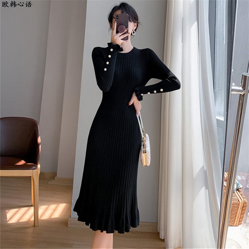 法式高级感配大衣鱼尾针织连衣裙女秋冬加厚内搭修身毛衣打底裙子