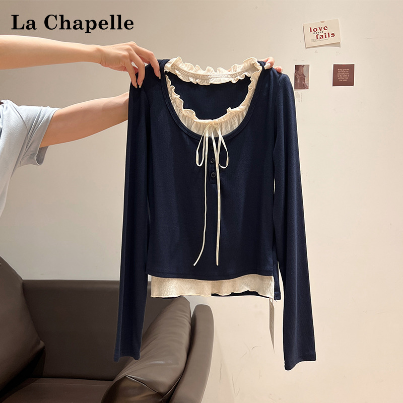 拉夏贝尔藏蓝长袖t恤女2025年秋季韩系假两件拼接木耳边正肩上衣