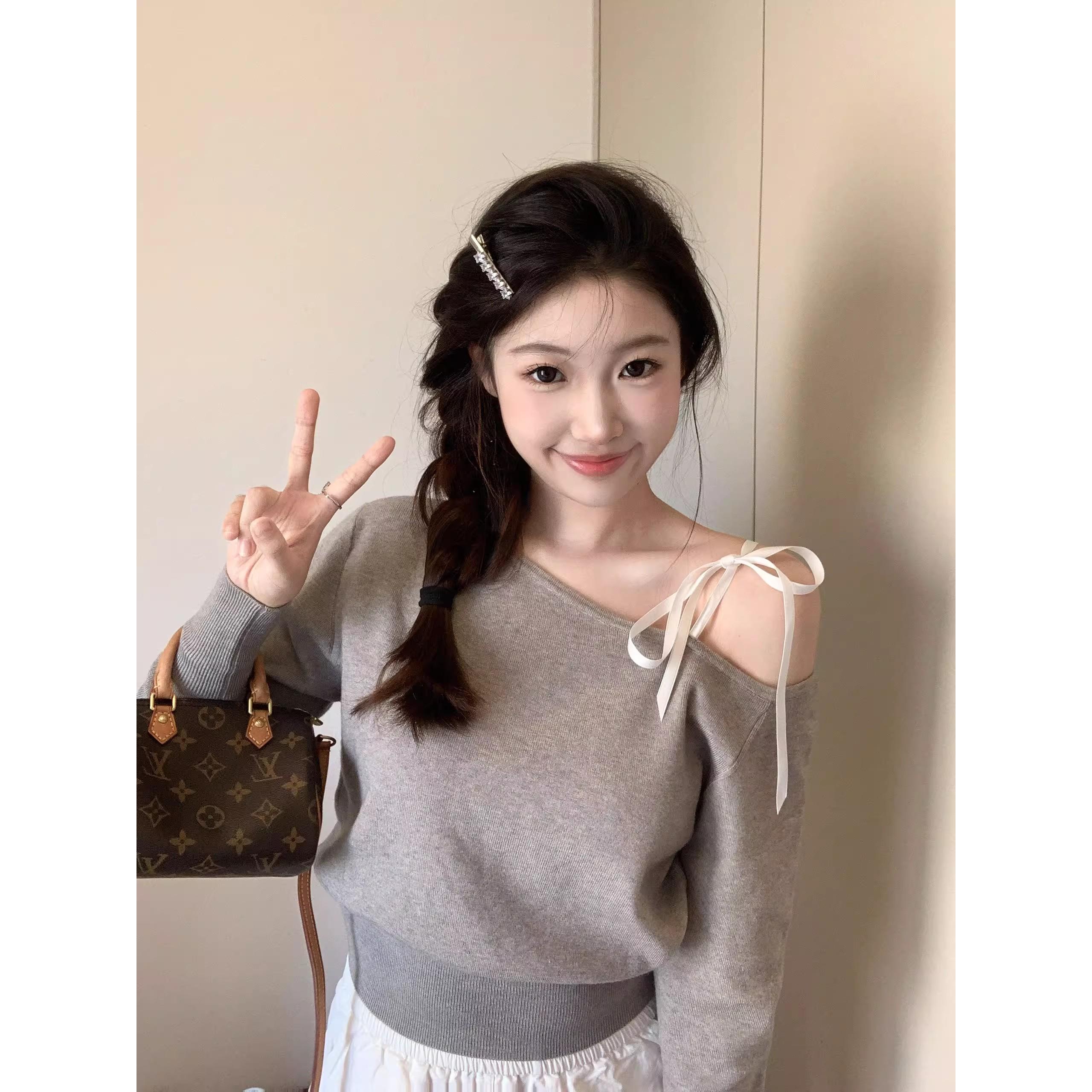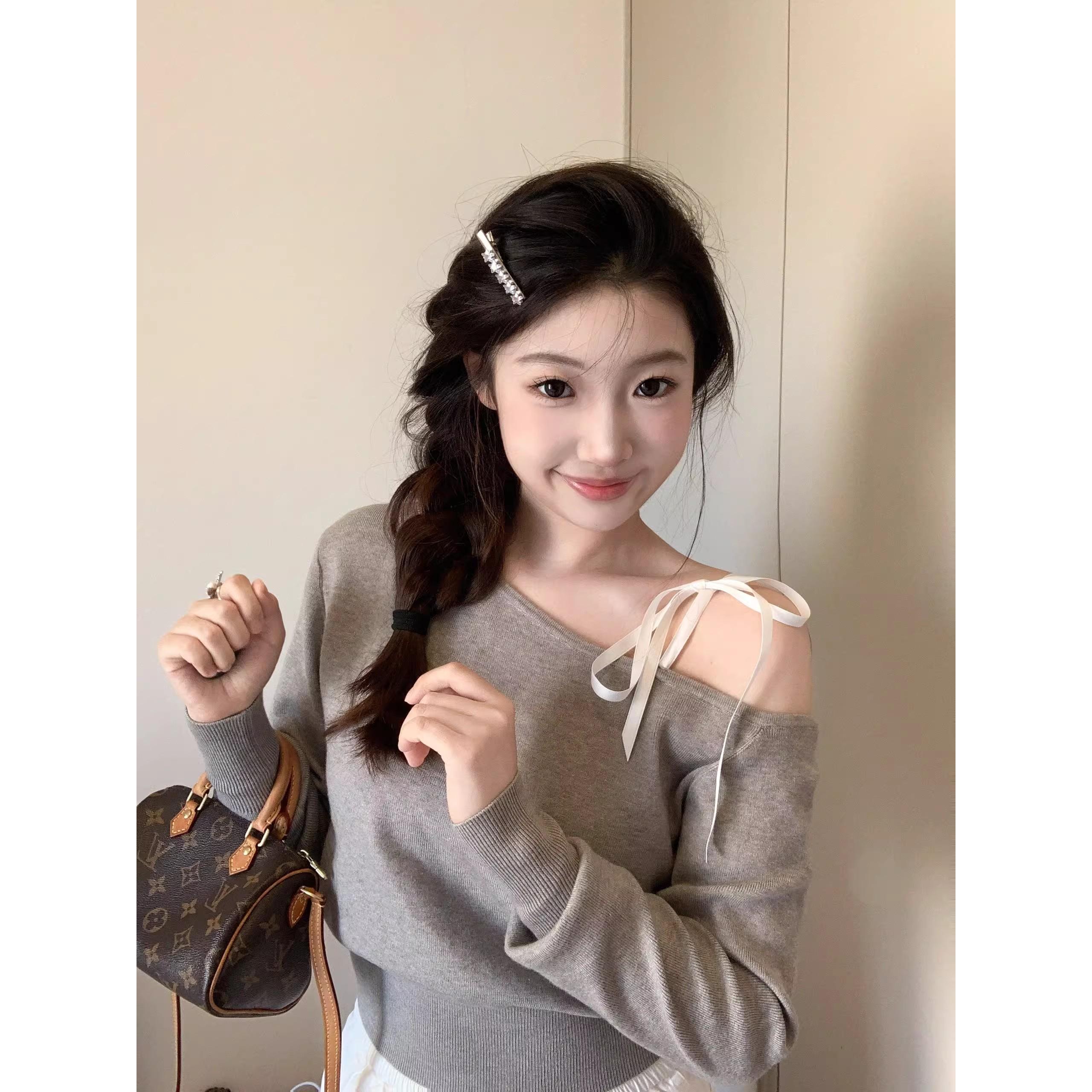 灰色高级感一字肩系带长袖针织衫女早秋修身收腰chic露肩打底上衣