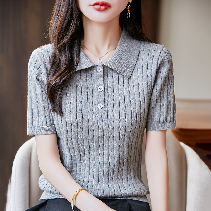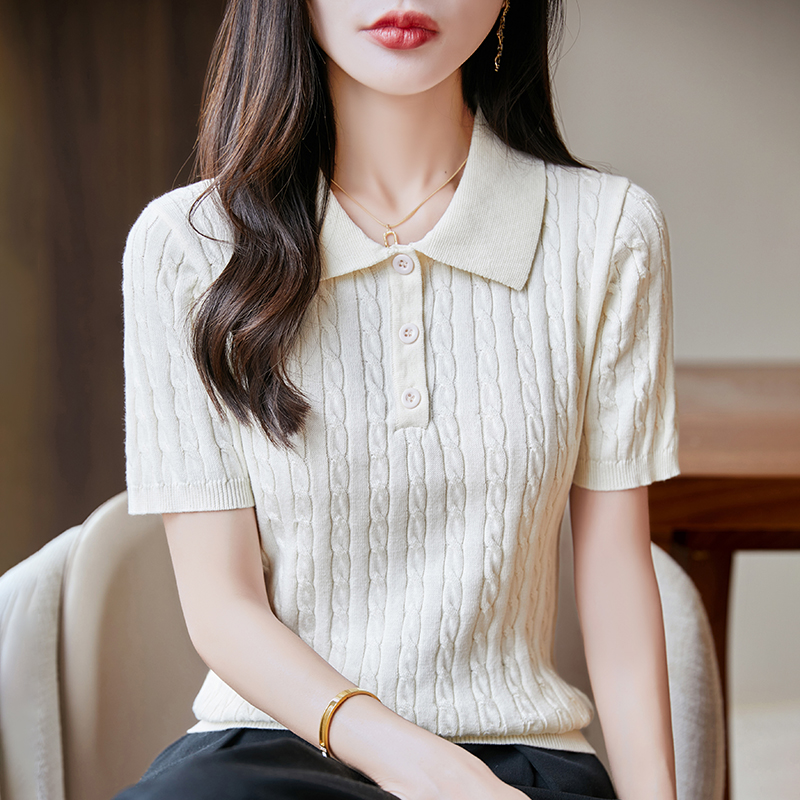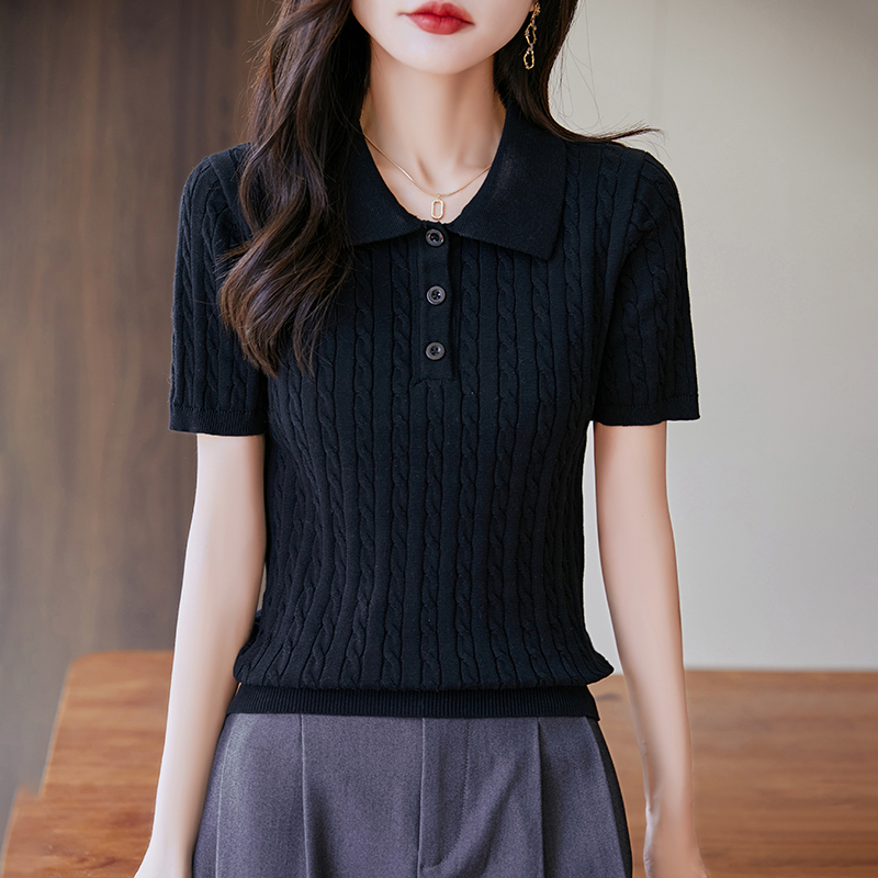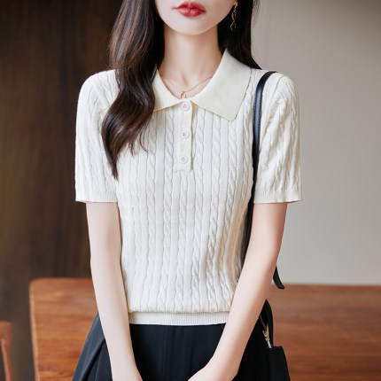 2025春秋新款女纯棉线麻花针织短袖女POLO领半开扣纯色百搭上衣潮