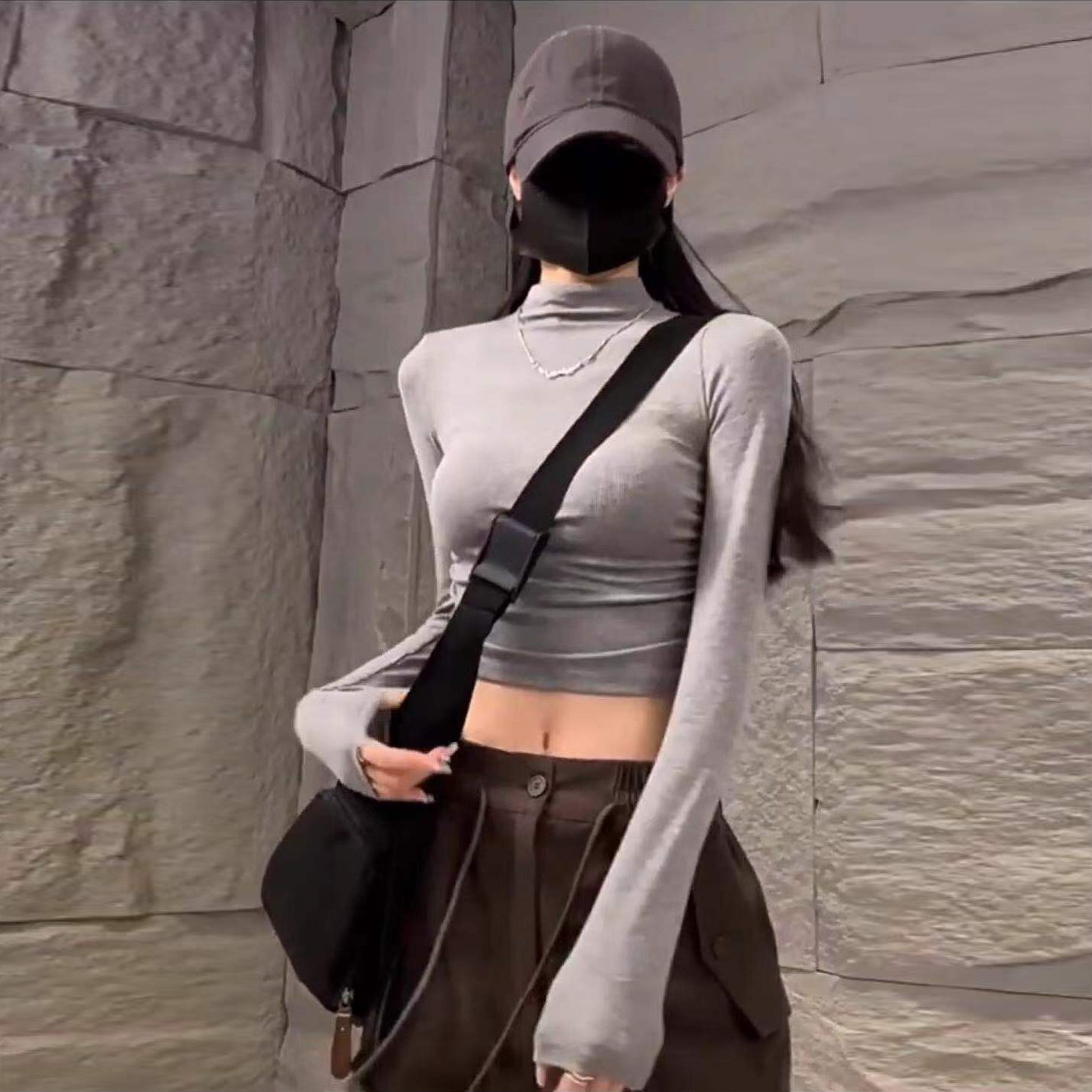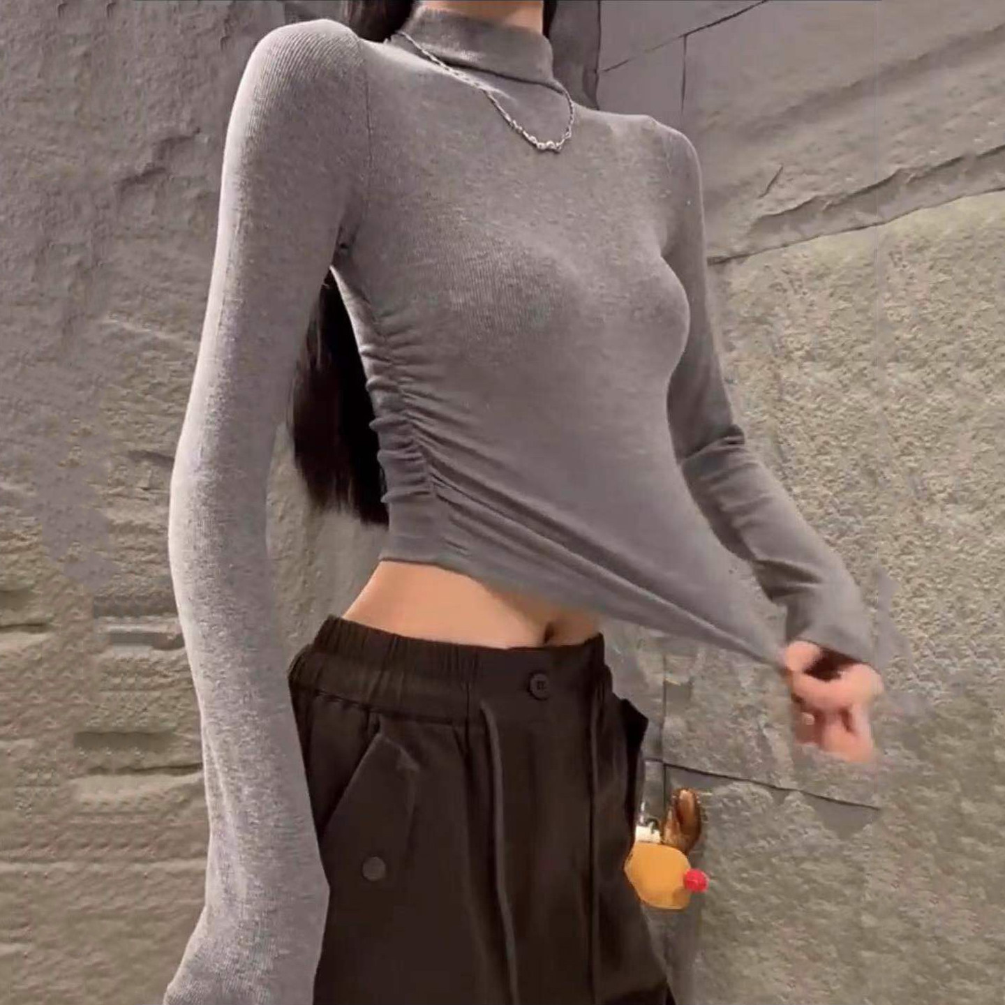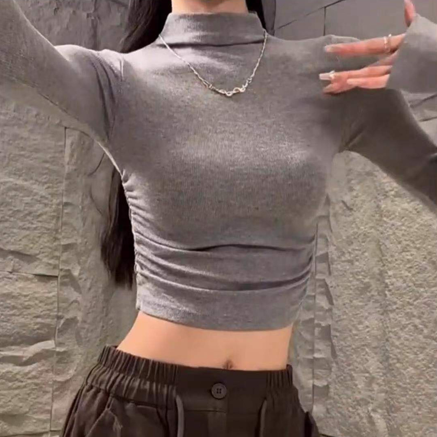 辣妹紧身褶皱内搭长袖上衣女秋冬半高领显瘦收腰短款打底掐腰T恤