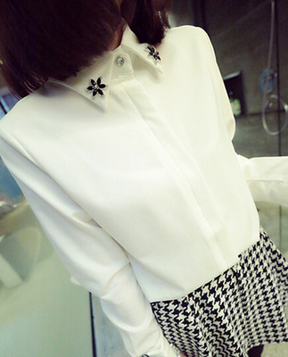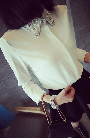 镶钻衬衫女带钻领子钉珠水钻秋冬雪纺白色翻领长袖韩版衬衣打底衫