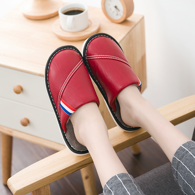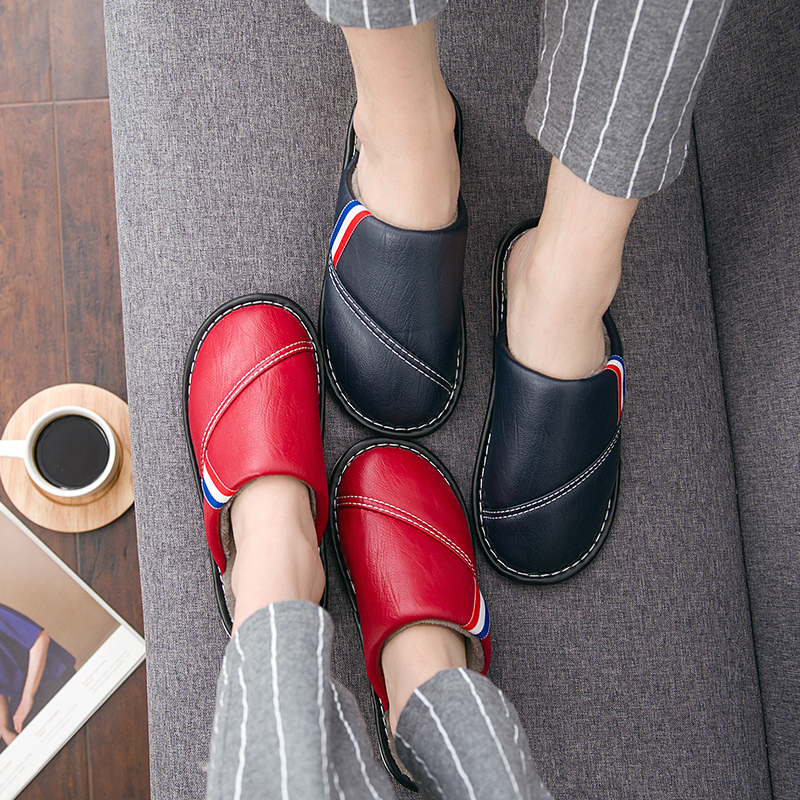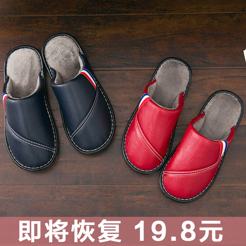 拖鞋家用秋冬女情侣防滑棉拖鞋男防水PU皮冬季保暖软底毛绒室内