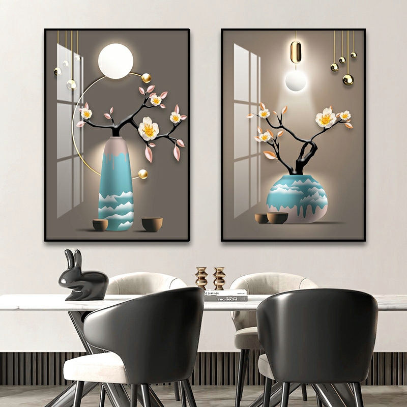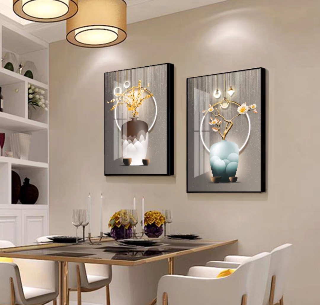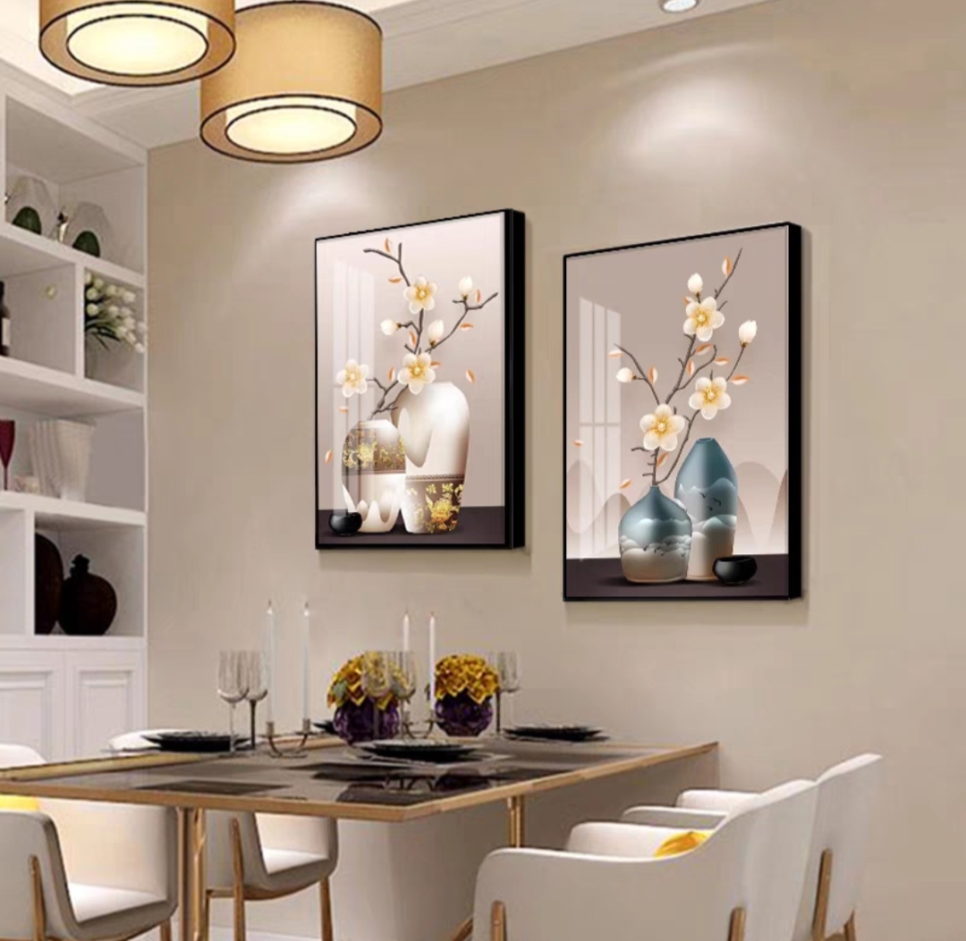 花开富贵餐厅装饰画客厅餐桌双联背景墙壁画轻奢晶瓷饭厅酒店挂画