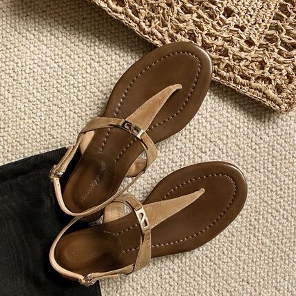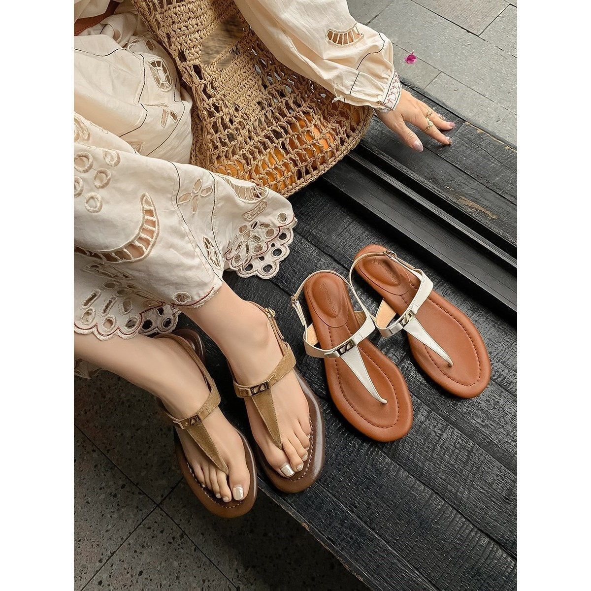 2026夏季新款ins风网红同款平底欧洲站真皮夹趾沙滩鞋罗马凉鞋女