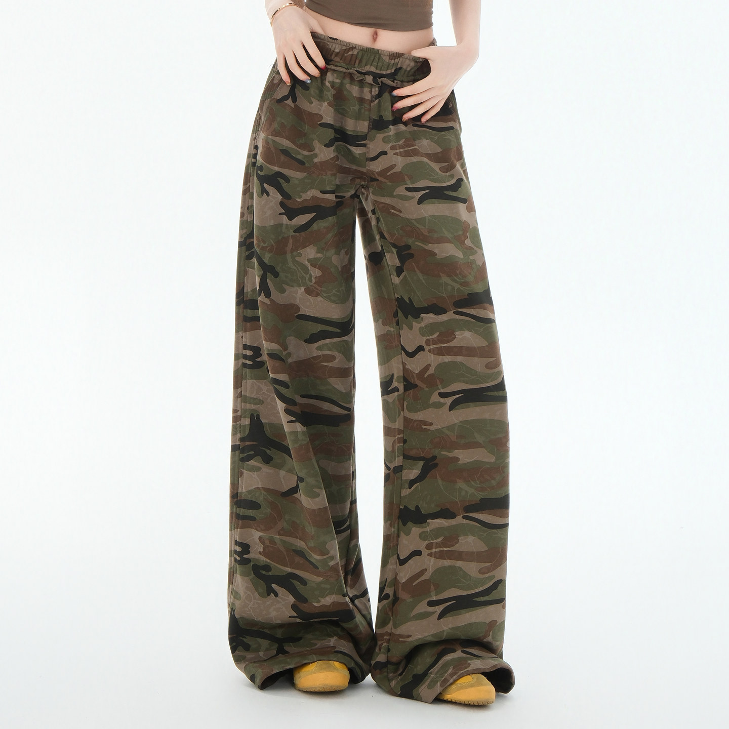 美式松紧腰迷彩印花工装女秋季新款高腰宽松显瘦直筒阔腿休闲长裤