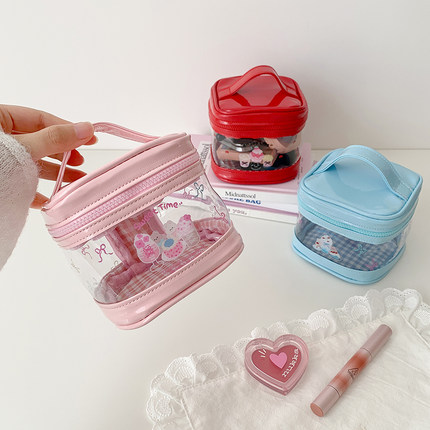 Hisocute卡通透明手提遛娃包少女玩偶公仔收纳包学生便携化妆包