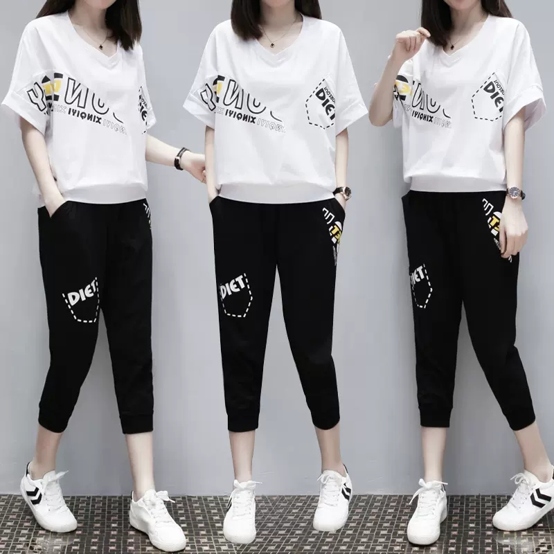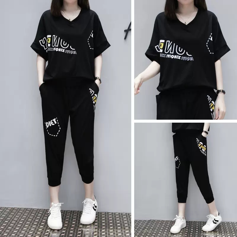 运动套装女夏季2023新款女装韩版宽松短袖七分裤大码运动服两件套