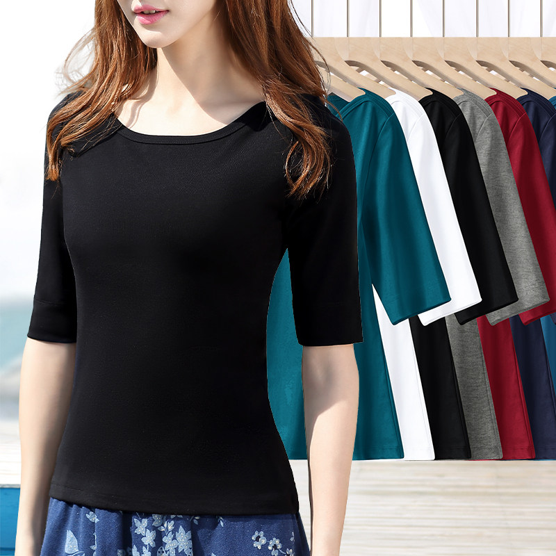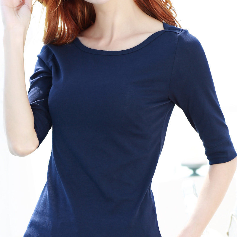黑色露锁骨一字肩上衣女螺纹夏季修身基础款中袖七分袖t恤打底衫