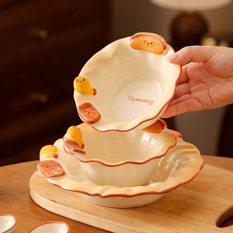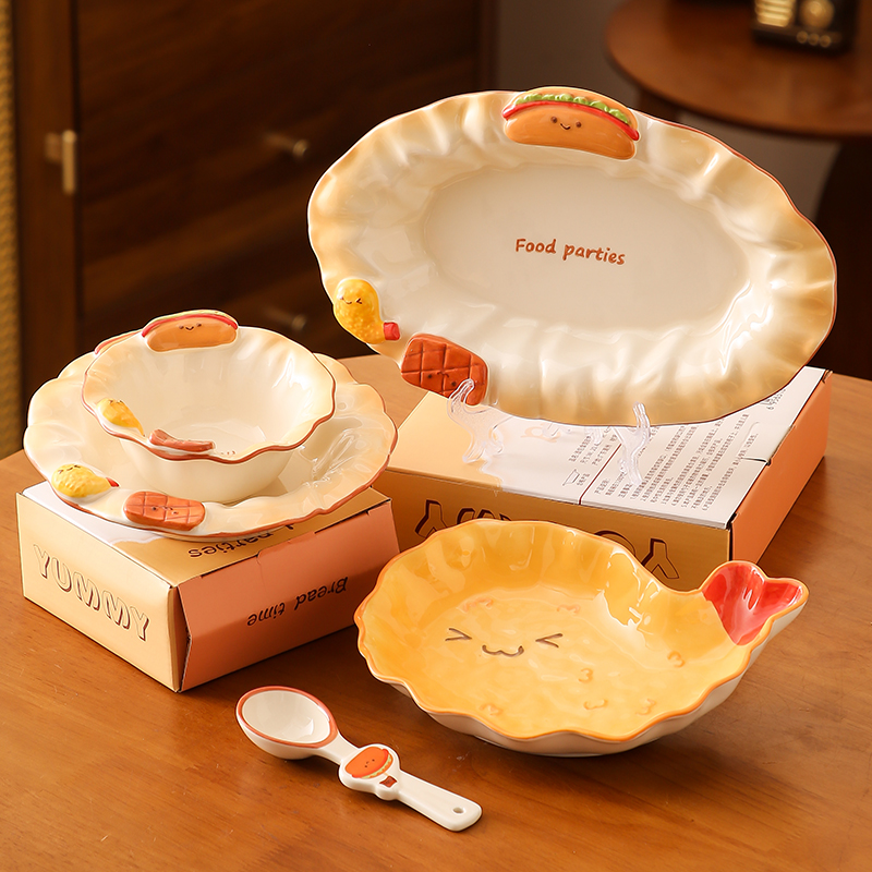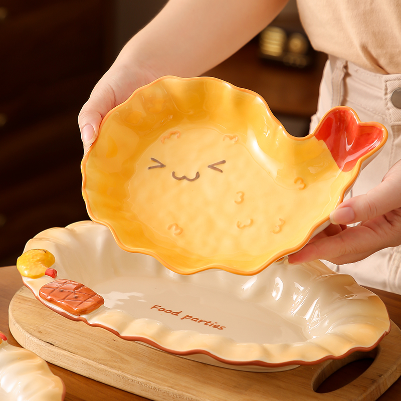 卡通浮雕釉下彩碗盘勺餐具可爱炸虾造型盘家用米饭甜品碗女一人食
