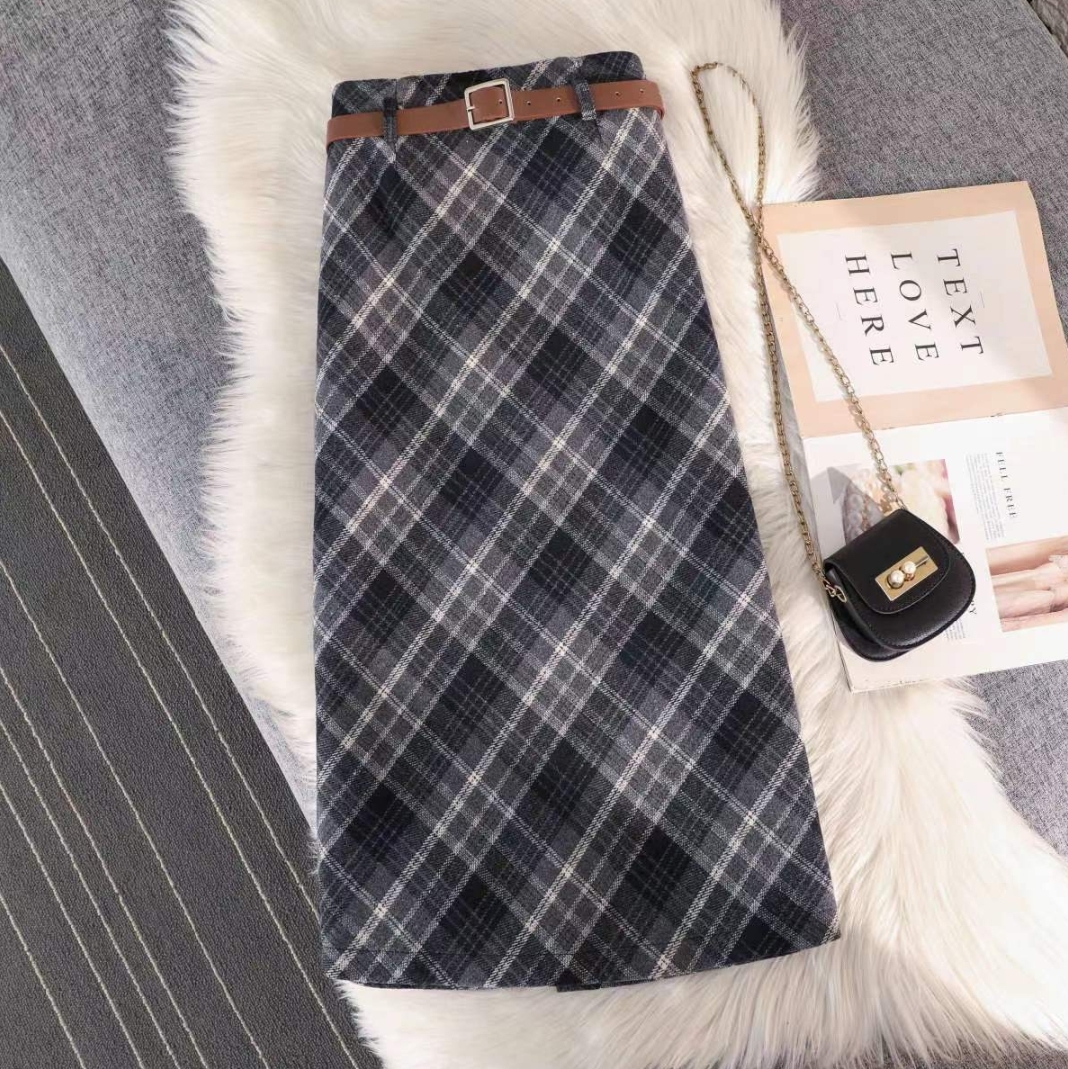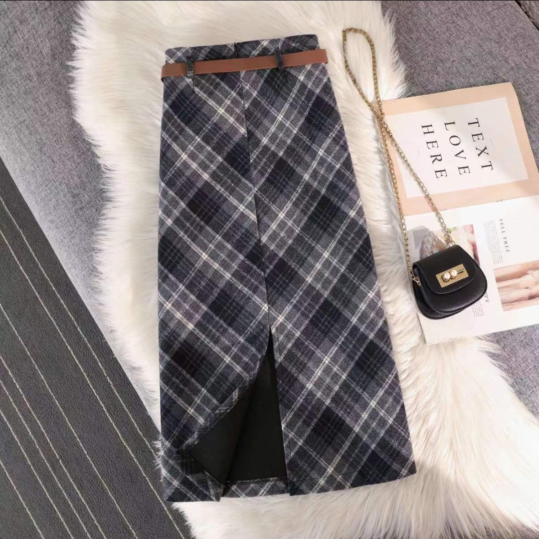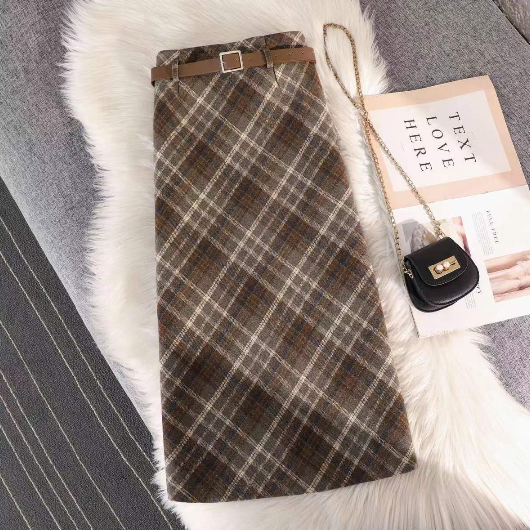 高级复古格子毛呢半身裙女2025秋冬显瘦开叉中长款a字皮带包臀裙