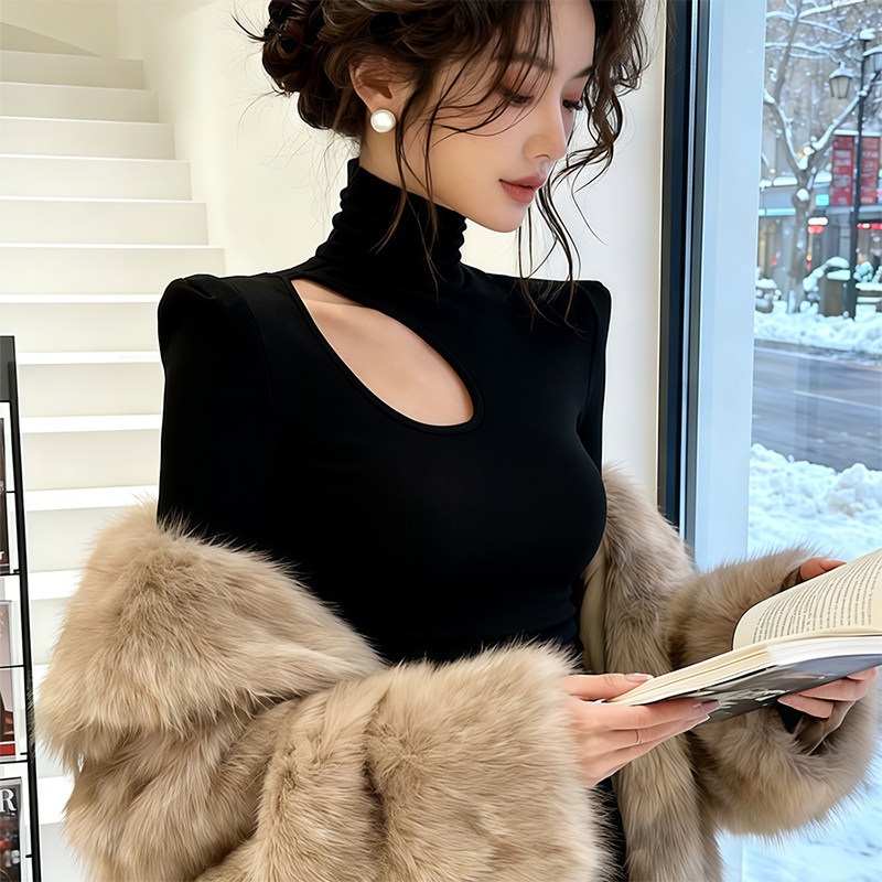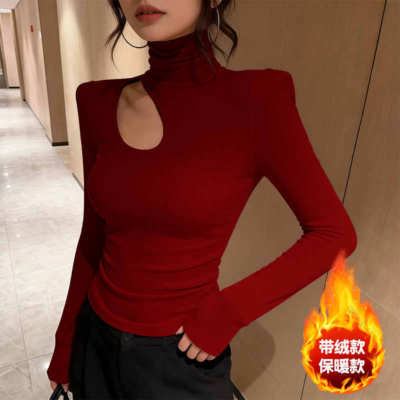 设计感镂空高领气质长袖T恤秋冬加绒修身辣妹小心机打底衫女百搭