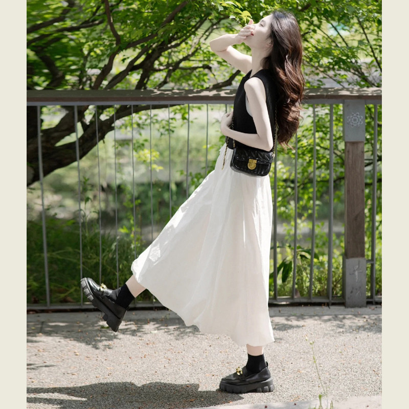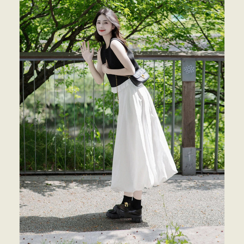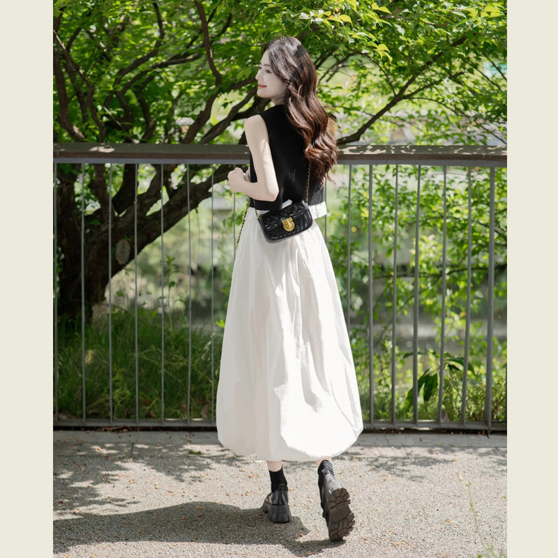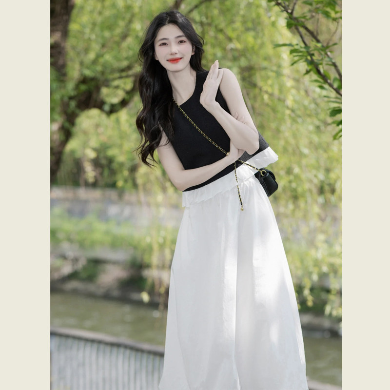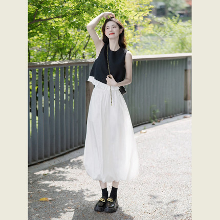 黑色背心花边拼接无袖上衣长裙套装女夏季高腰花苞半身裙两件套