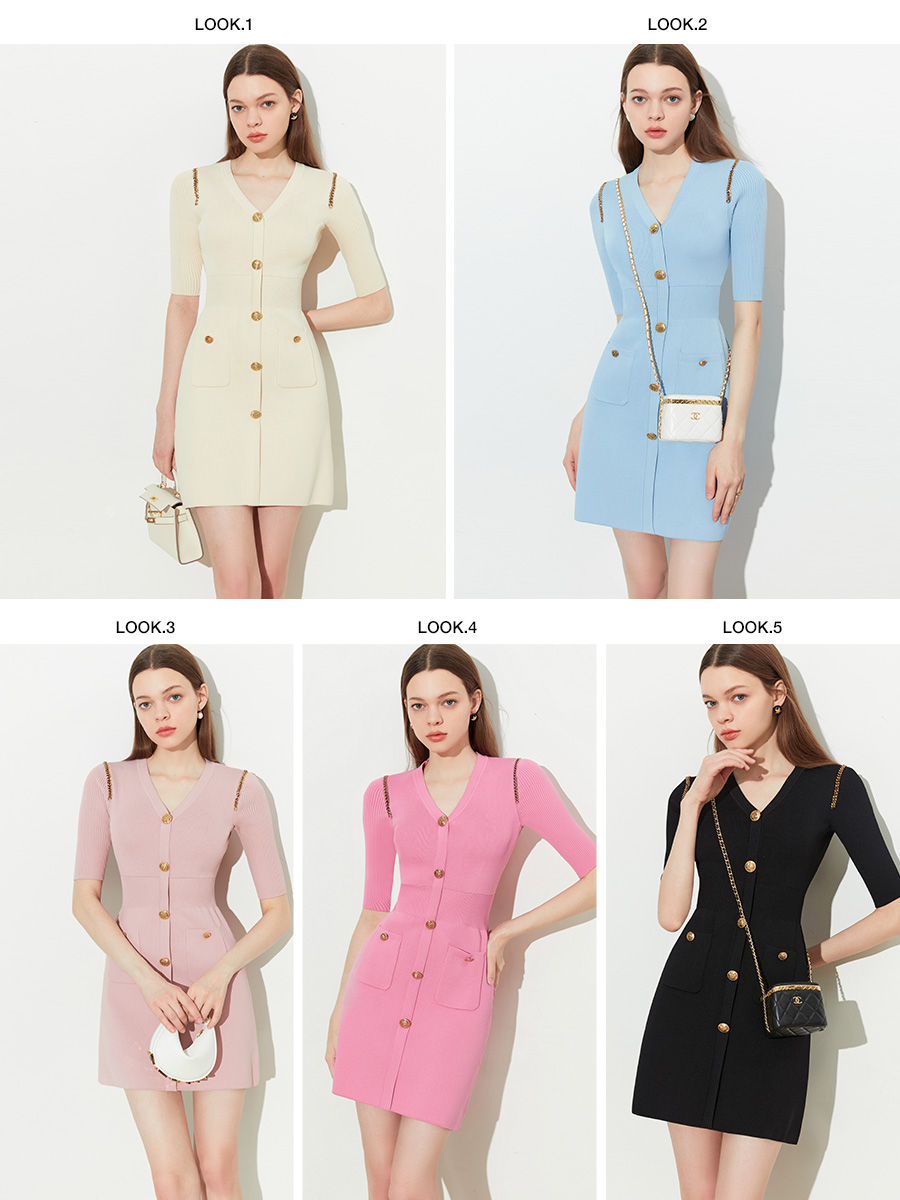DPLAY黑标秋新优雅经典黑V领修身工金属扣链条中袖针织连衣裙