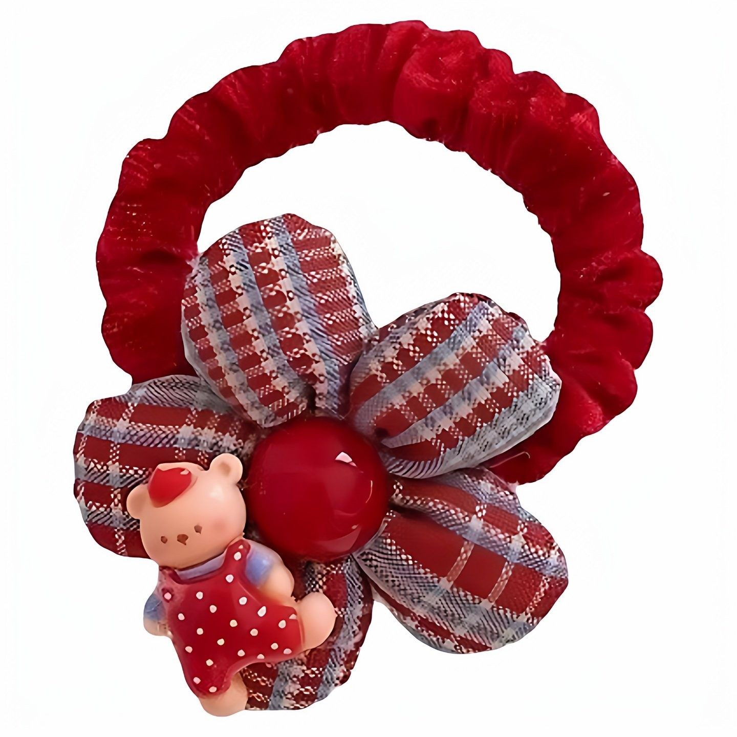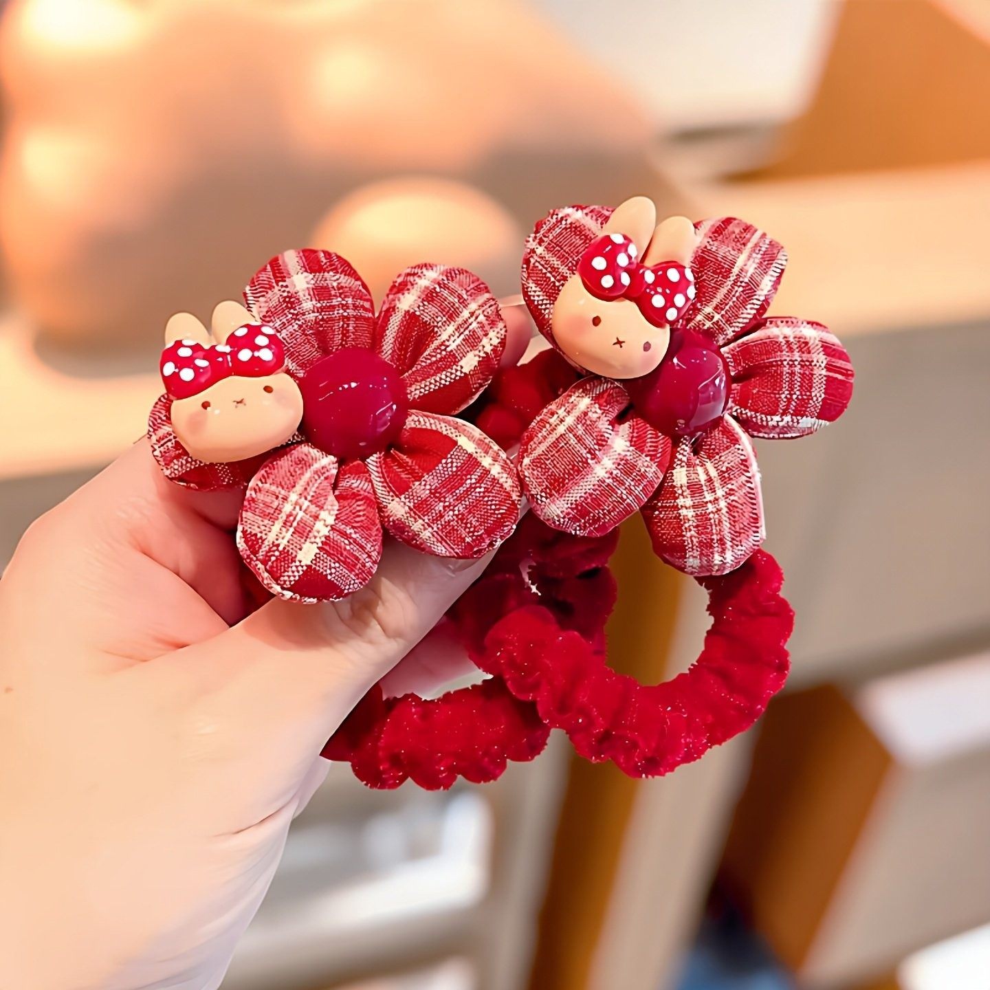 (儿童新年红色花朵发绳)甜美卡通发圈女童格子头饰不伤发皮筋