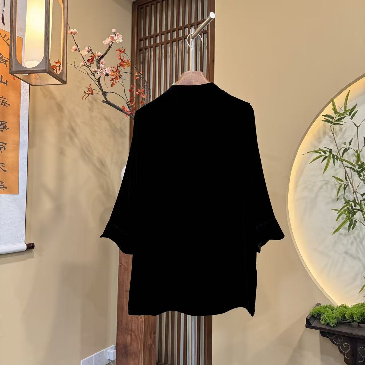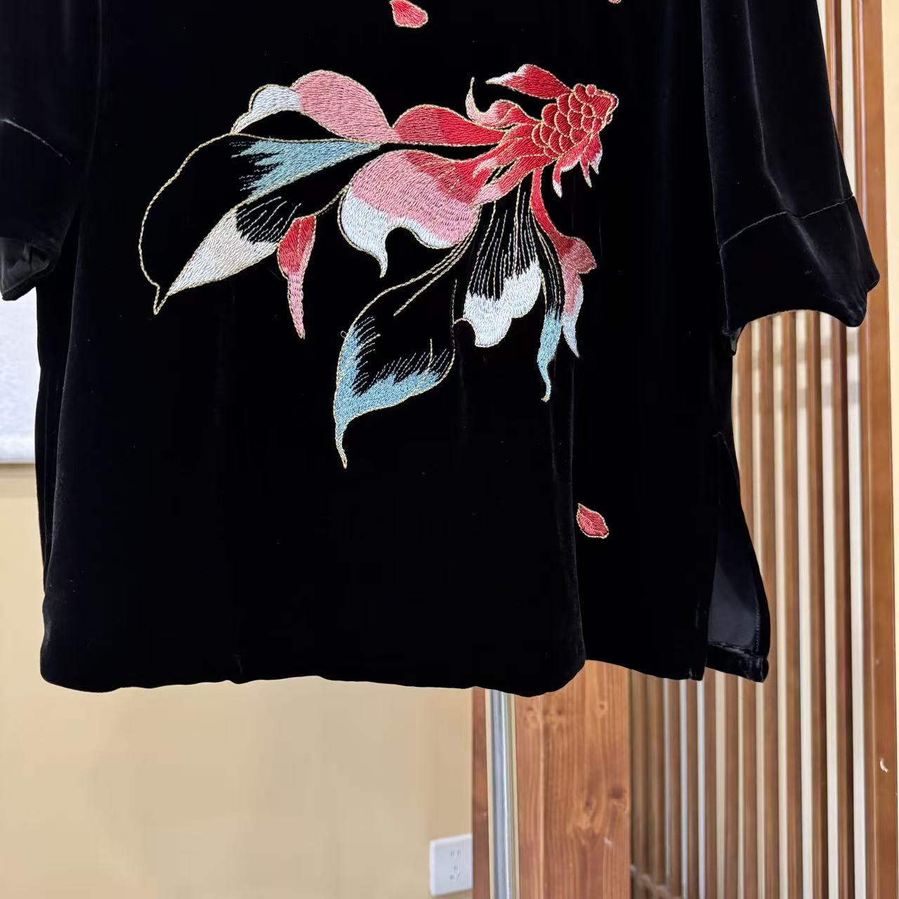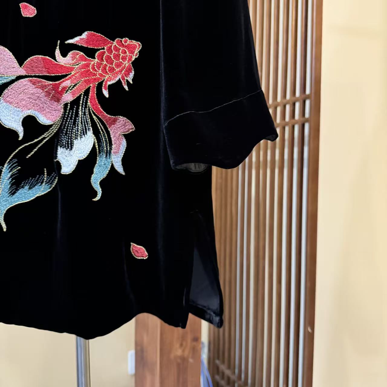 【中先森】重工锦鲤刺绣真丝丝绒上衣女秋季新中式国风桑蚕丝衬衫