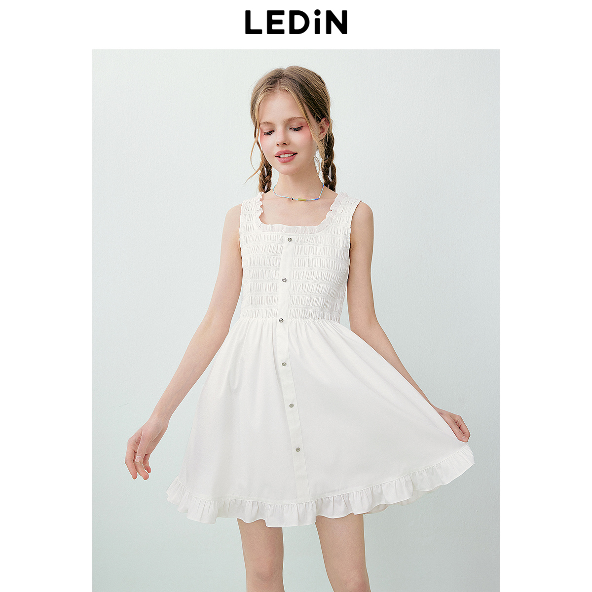 韩系打揽连衣裙夏季新款挺阔吊带背心裙装饰纽扣白色连衣裙