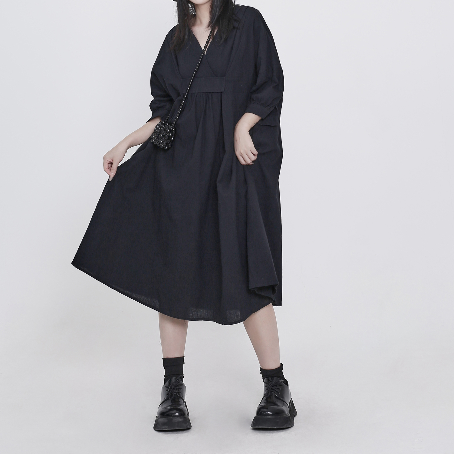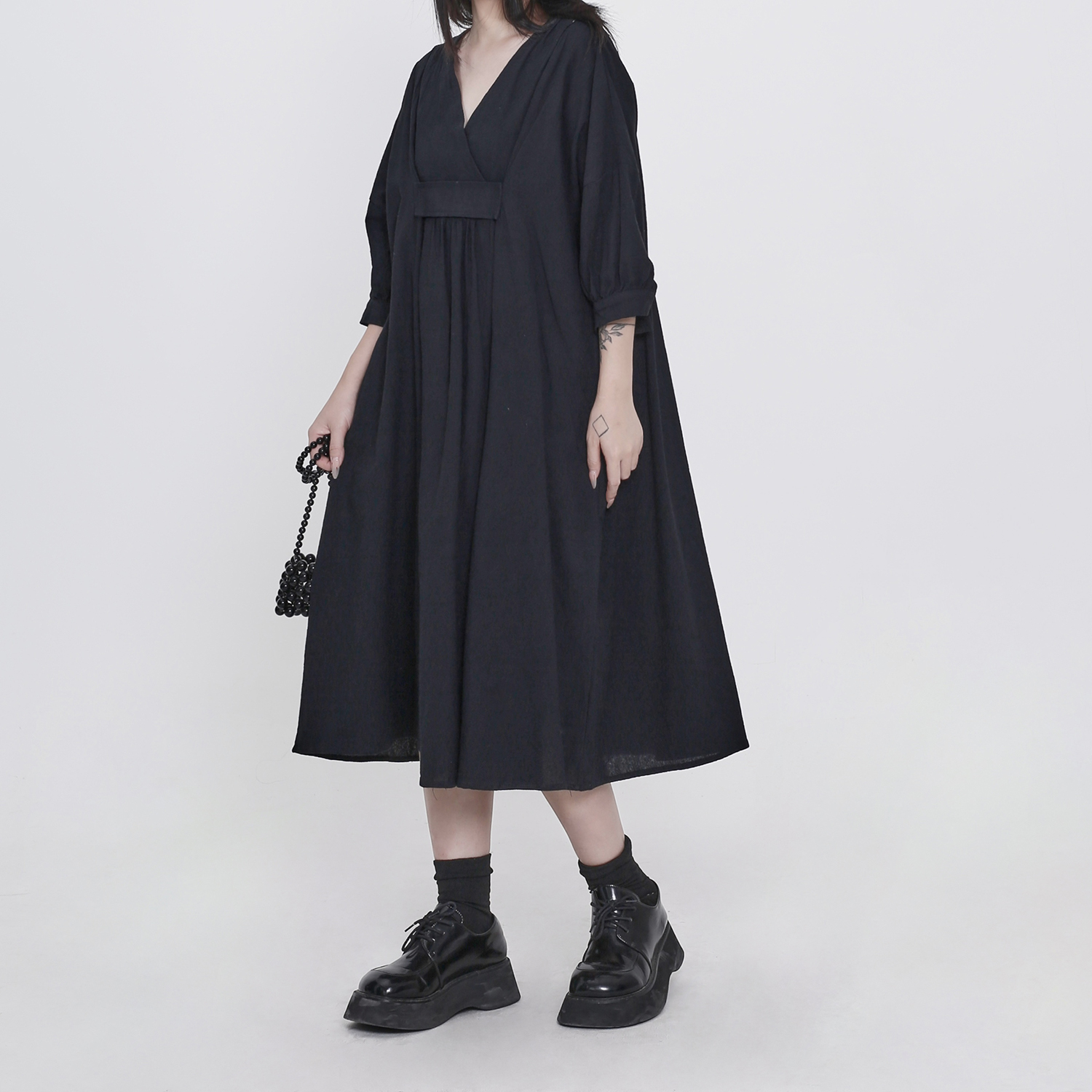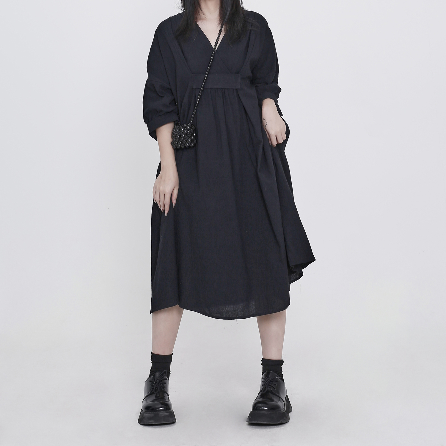隐觅 山本风暗黑系yohji秋季新品百搭小众宽松棉麻设计V领连衣裙