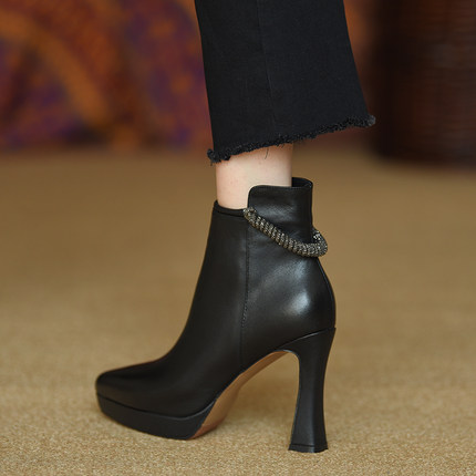 misili 真皮粗跟短靴女2024冬季新款尖头厚底高跟鞋侧拉链女靴子