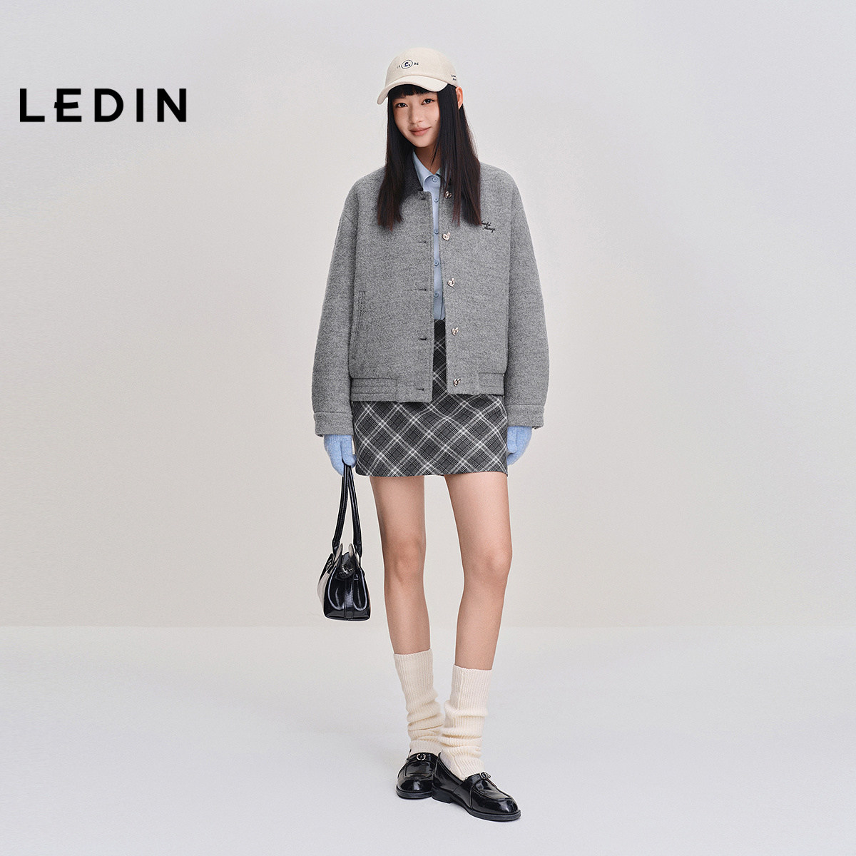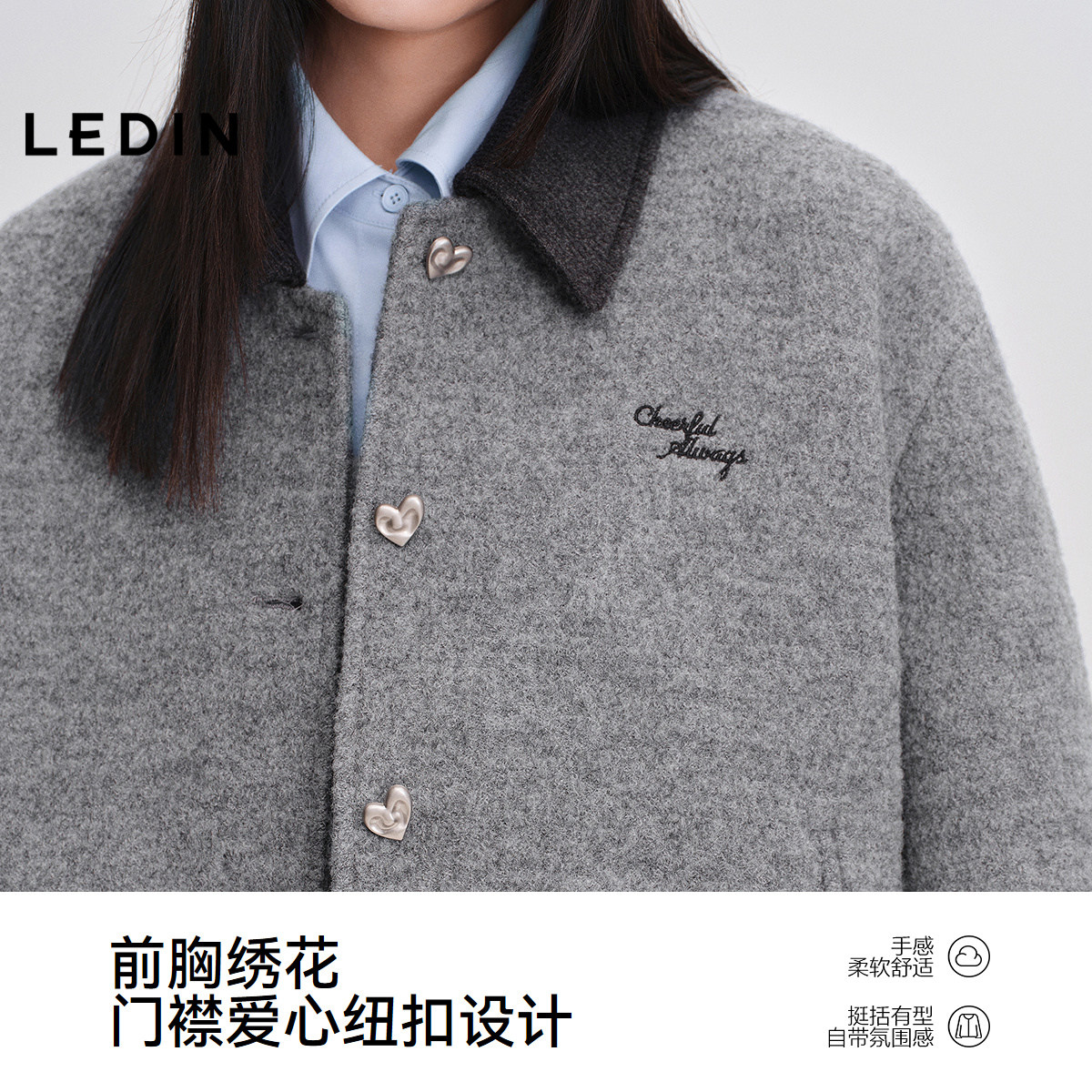 乐町撞色翻领短款外套女秋冬新甜美爱心纽扣字母绣花全羊毛呢大衣